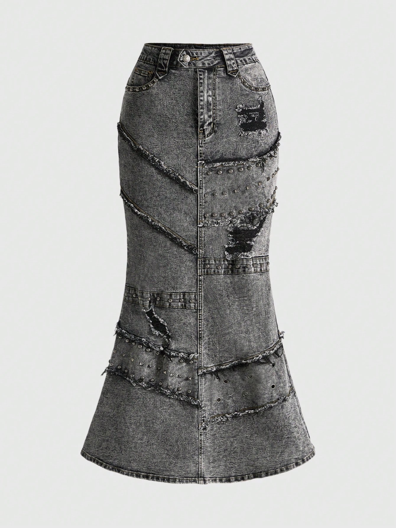 EDITION Y2K Punk Rivet Decor Distressed Vintage Wash Bodycon Denim Mermaid Skirt