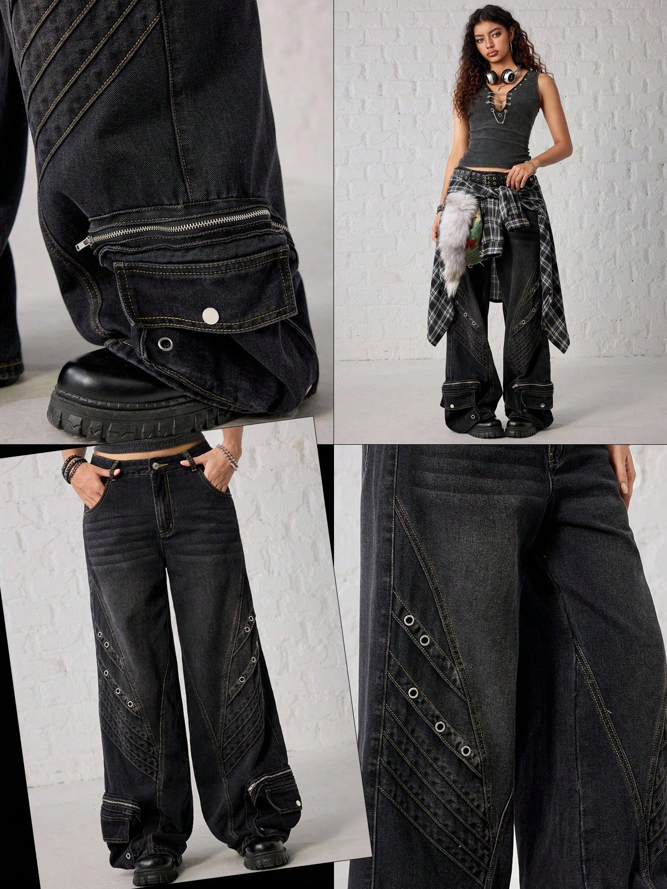 Grunge Punk Y2K Punk Rivet Decor Distressed Vintage Washed Loose Flare Jeans