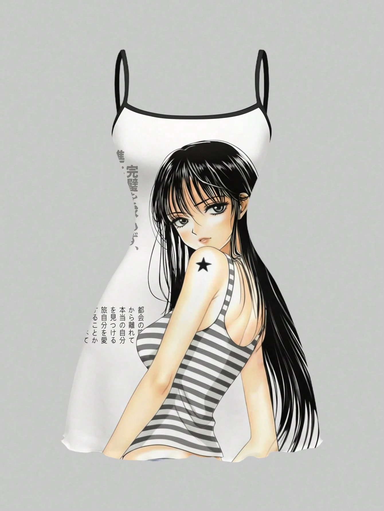 Grunge Punk Y2K Retro Cartoon Girl Graphic Striped Long Hair Mini Dress With Japanese Slogan