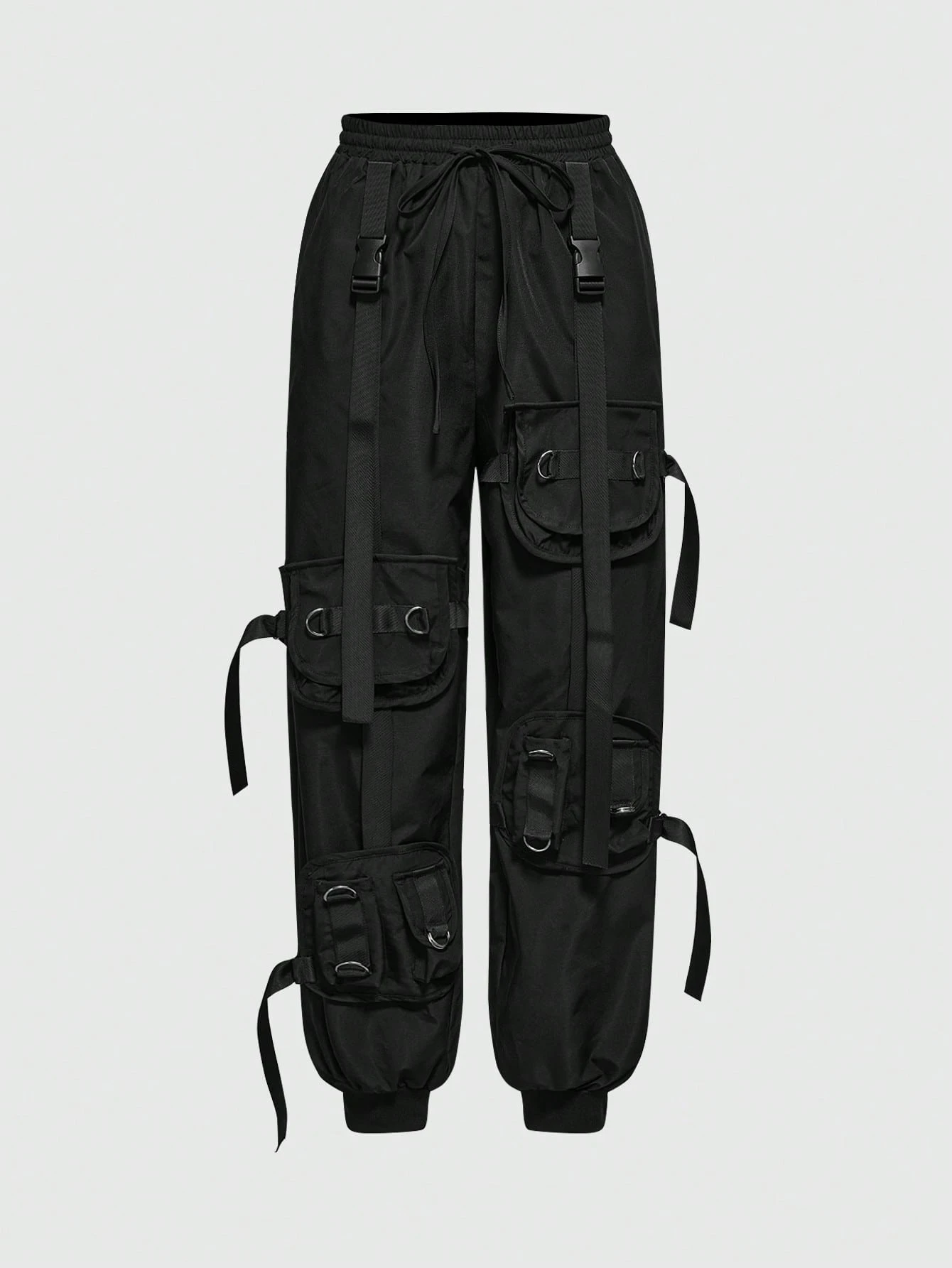Grunge Punk Y2K Retro Functional Style 3D Pocket Decoration Adjustable Drawstring Elastic Waist Women Long Pants