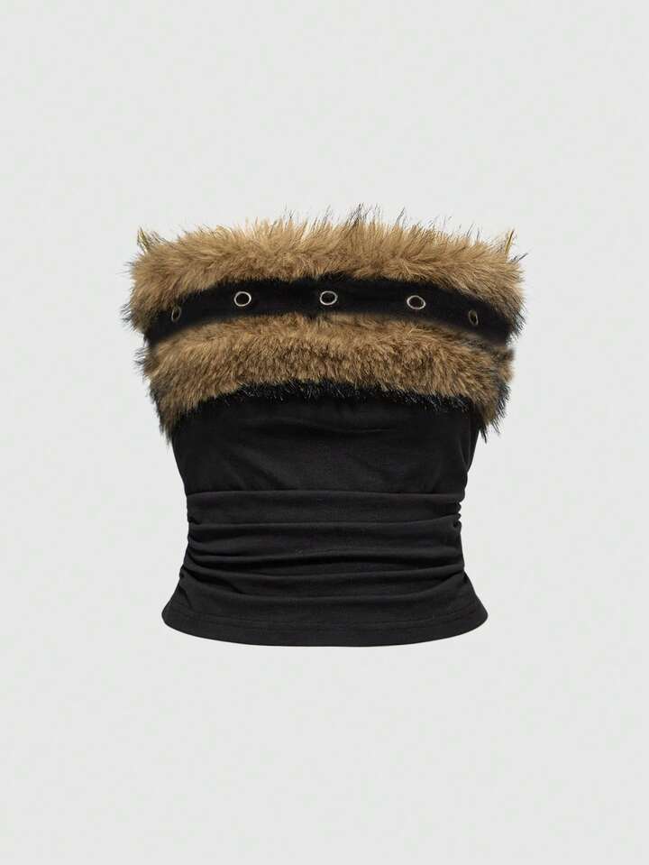 Grunge Punk Y2K Sexy Animal Print Buckle Crop Top With Faux Fur Collar