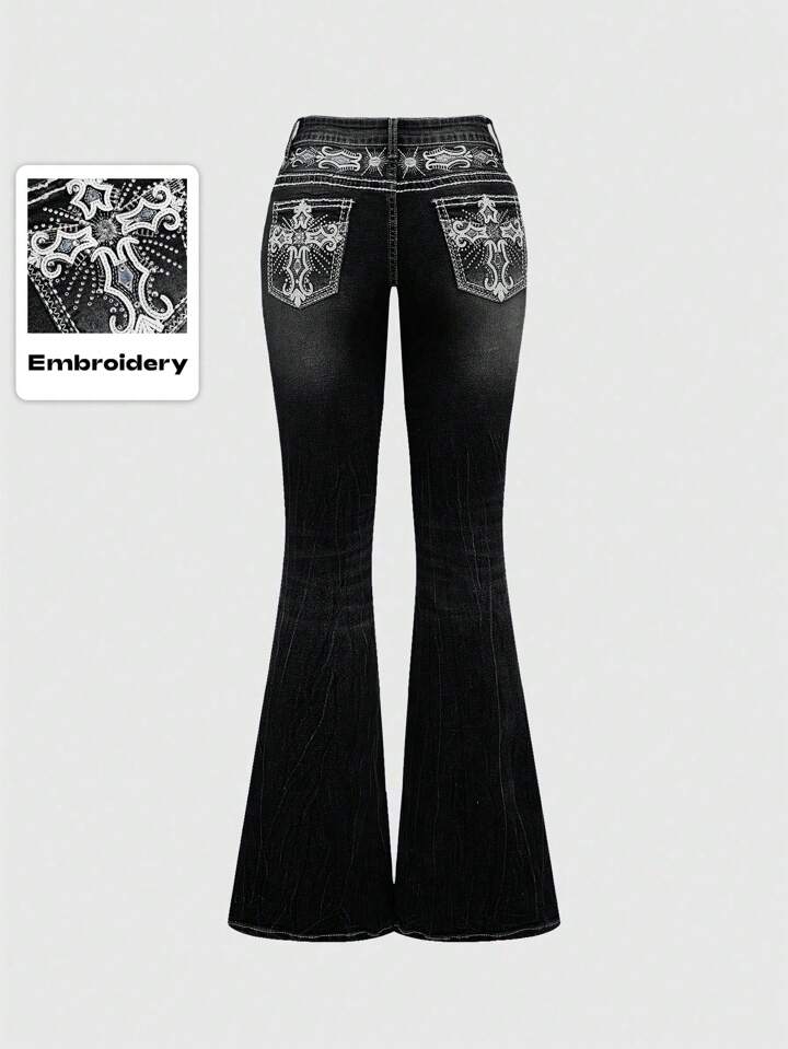 Grunge Punk Y2K Vintage Millennium Sexy Pocket Cross Wing Embroidery Fitted Flare Plus Size Jeans