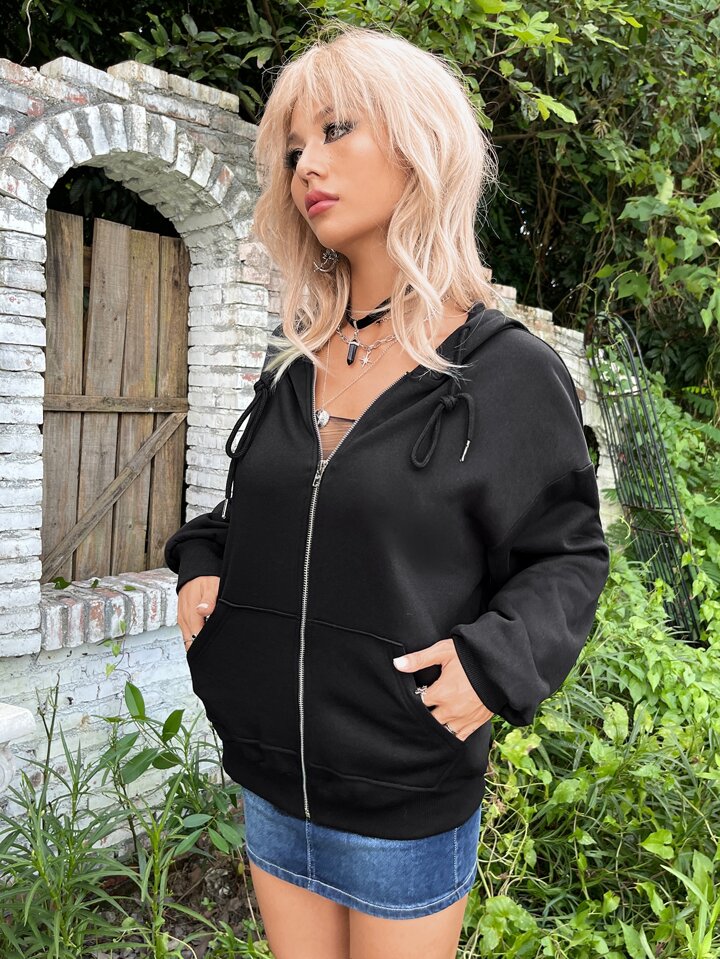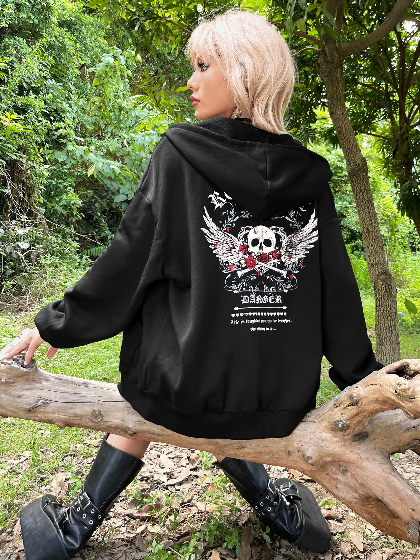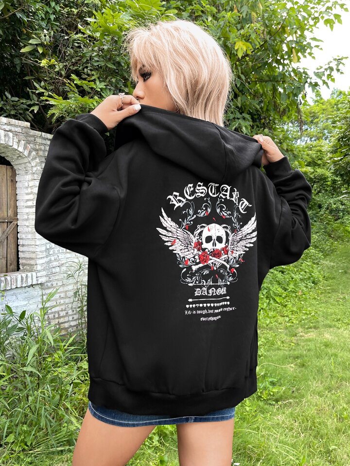 Grunge Skull & Slogan Graphic Zip Up Drop Shoulder Hoodie