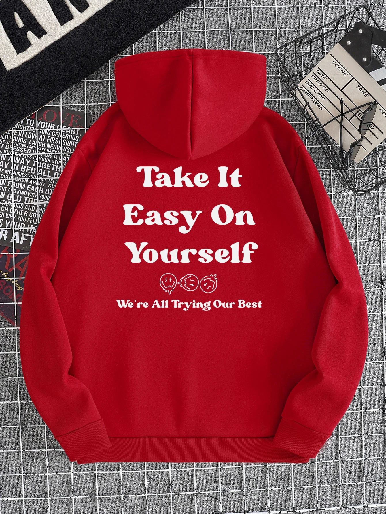 Guys Cartoon And Slogan Graphic Thermal Lined Kangaroo Pocket Drawstring Hoodie
