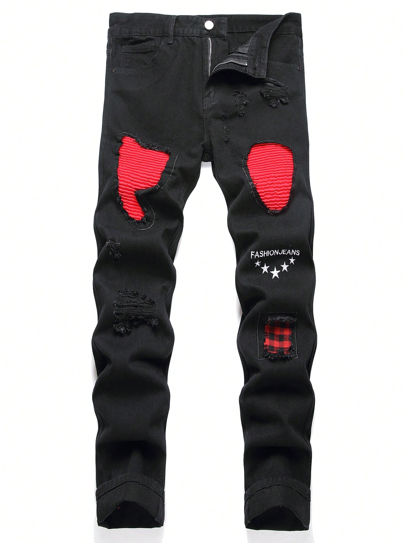 Guys Gingham & Letter Graphic Ripped Frayed Rag Stitching Jeans