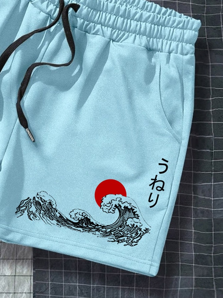Guys Japanese Letter & Wave Print Drawstring Waist Shorts