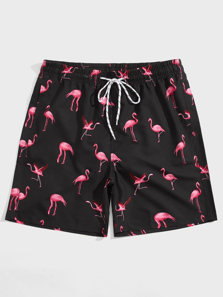 Guys Random Flamingo Print Drawstring Waist Swim Trunks