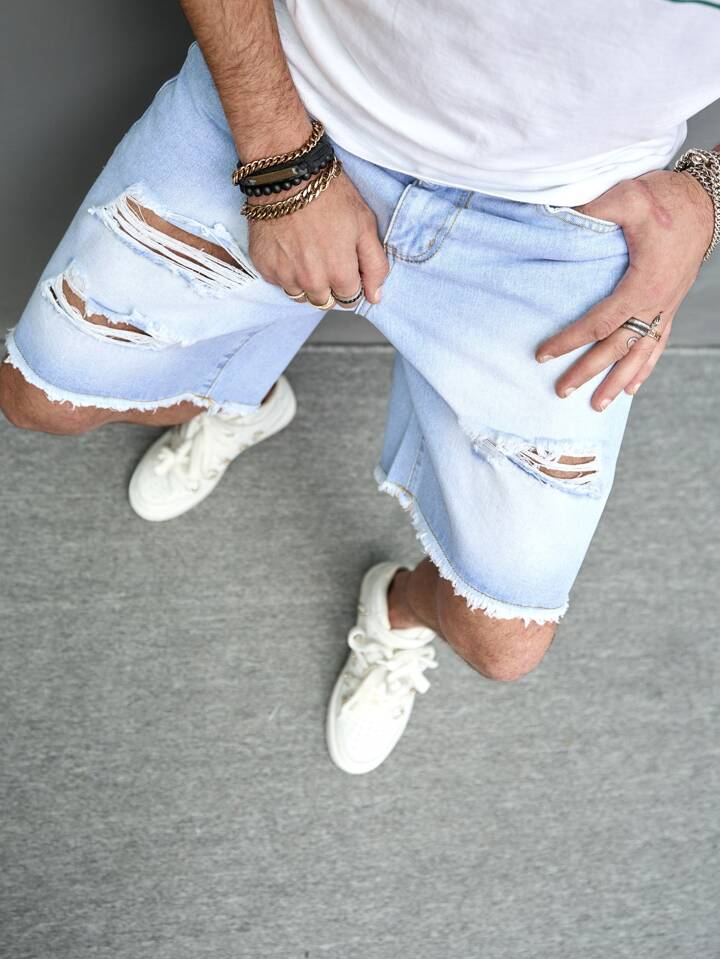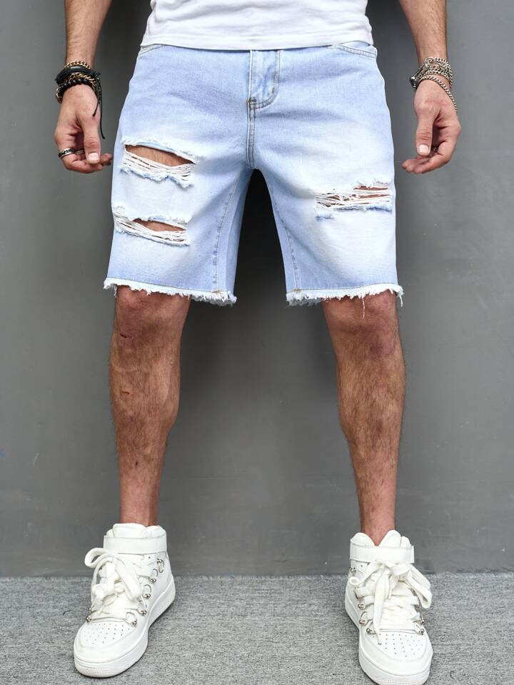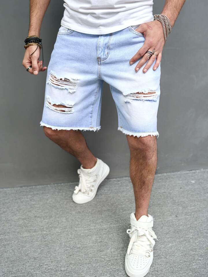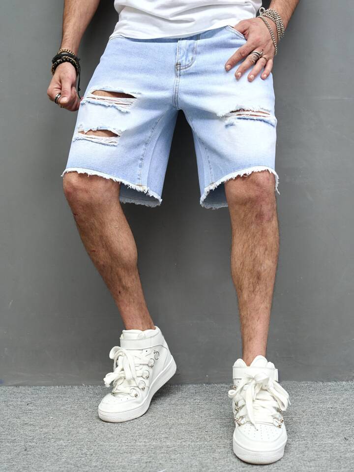 Guys Ripped Frayed Raw Hem Denim Shorts
