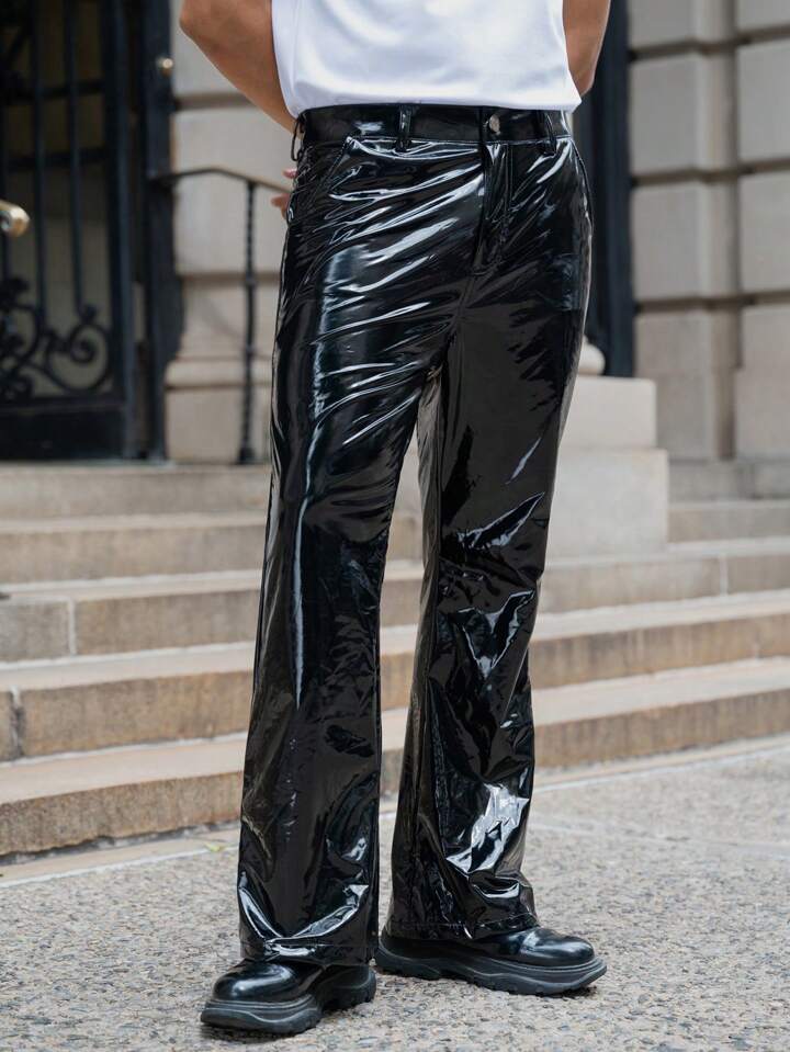 Guys Solid PU Leather Pants Without Belt