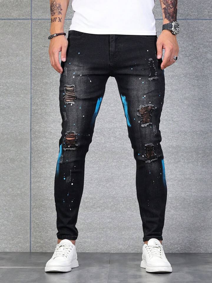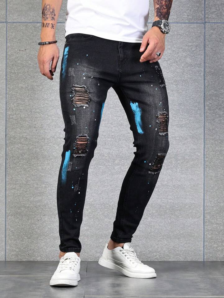 Guys Splash Ink Print Ripped Frayed Skinny Jeans