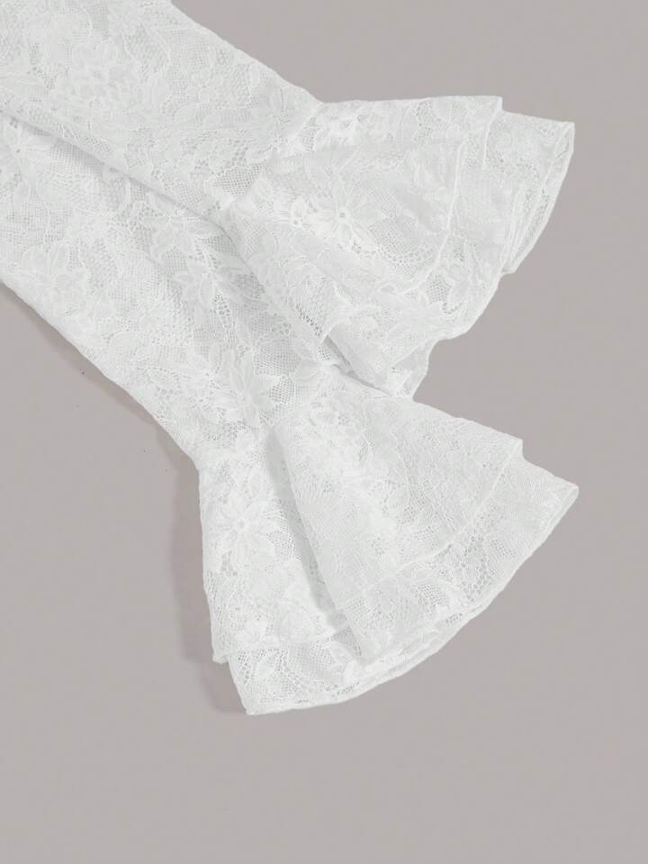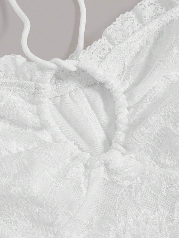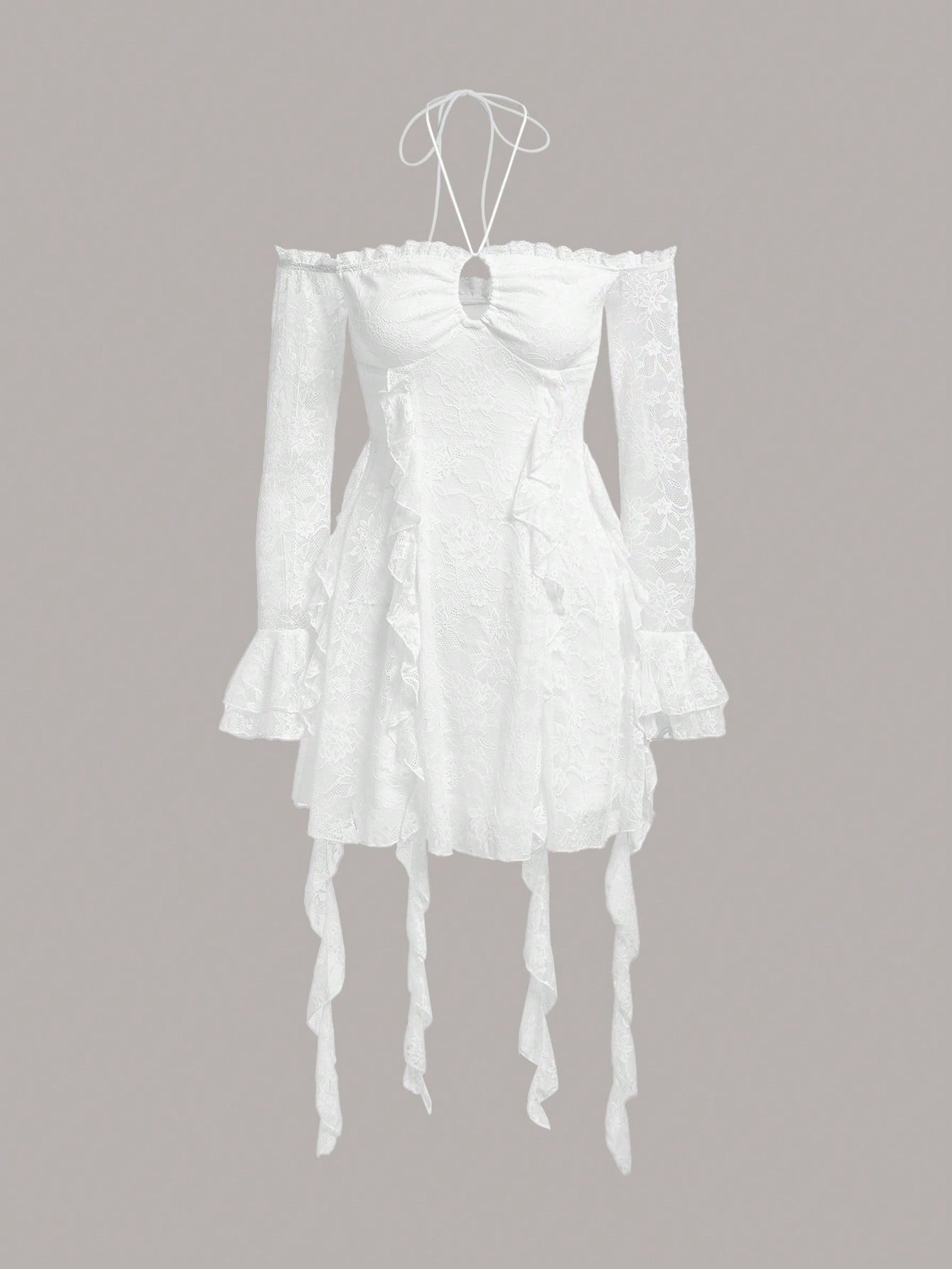 Halter Neck Ruffle Trim Flounce Sleeve Lace Overlay Dress
