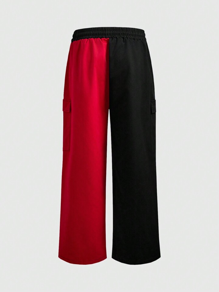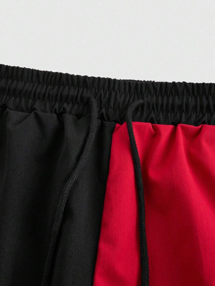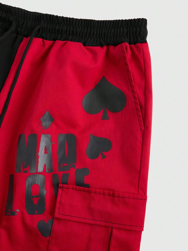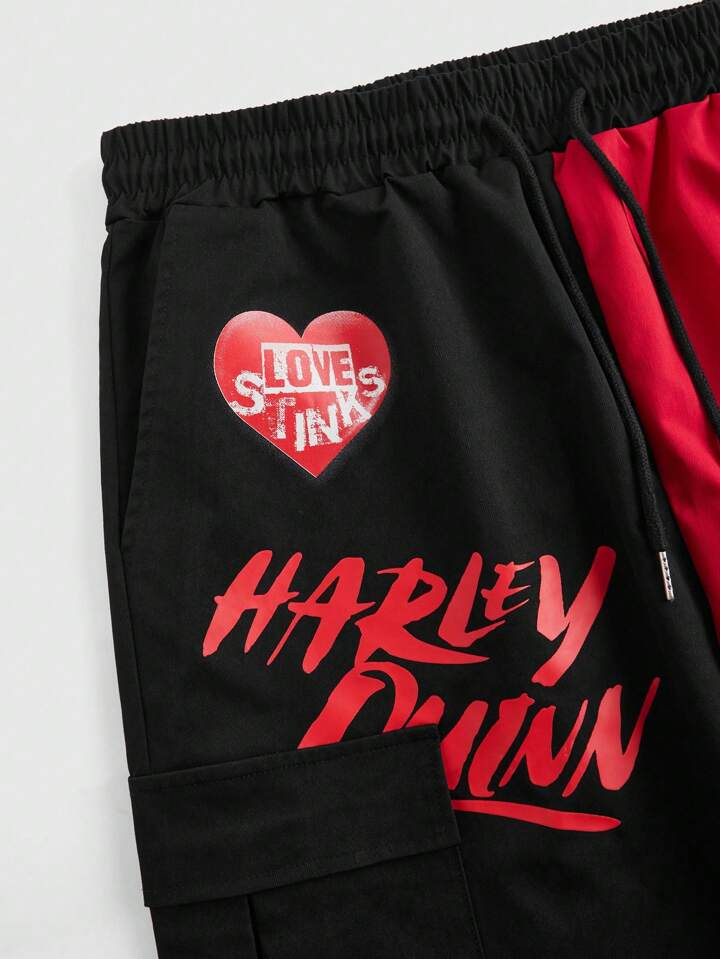 Harley Quinn | ROMWE Men's Casual Letter Print Two-Tone Drawstring Waist Slant Pocket Baggy Cargo Black And Red Pants