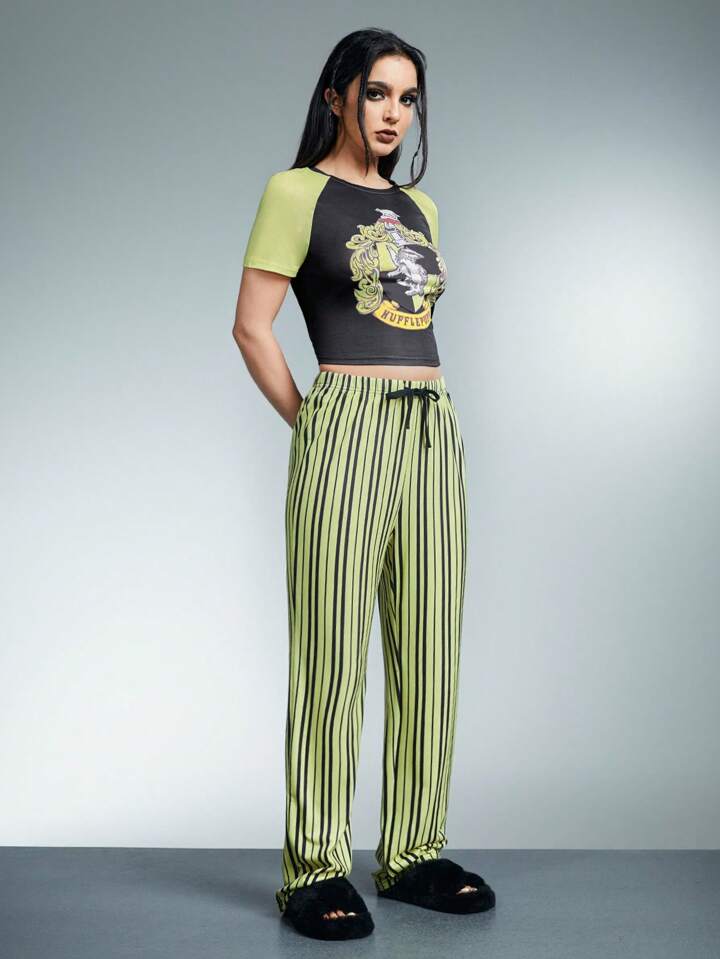Harry Potter | ROMWE Color Block Raglan Sleeve Crop Top & Loose Striped Women Pajama Set