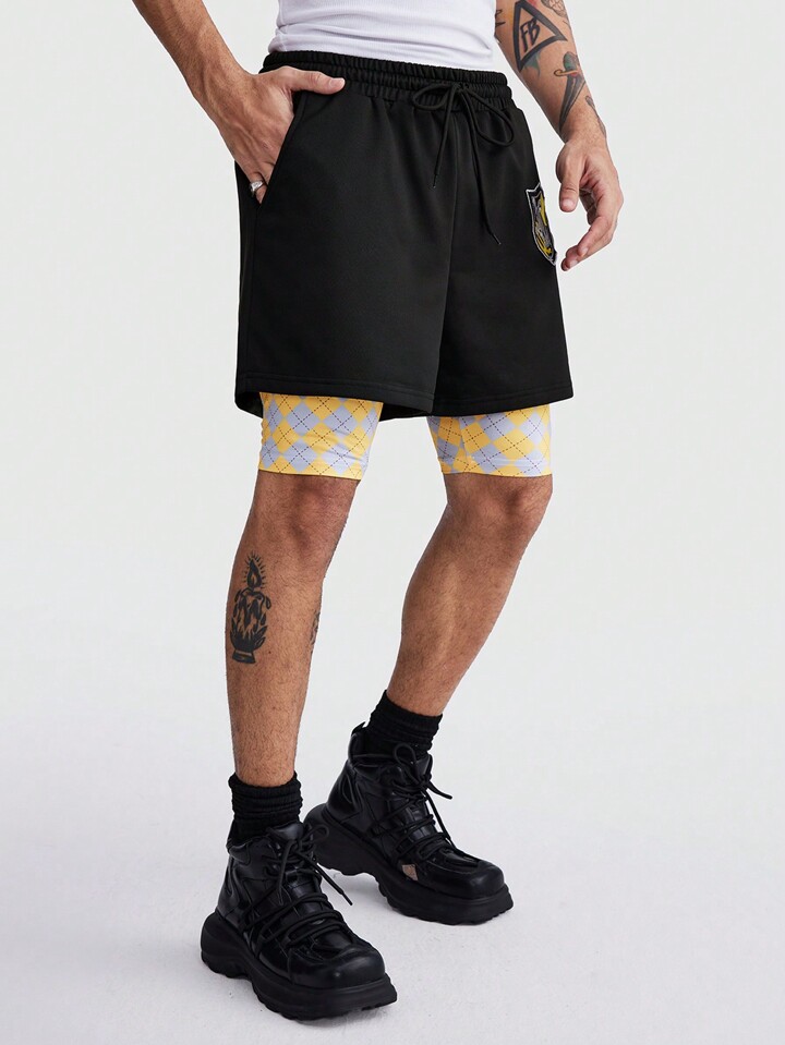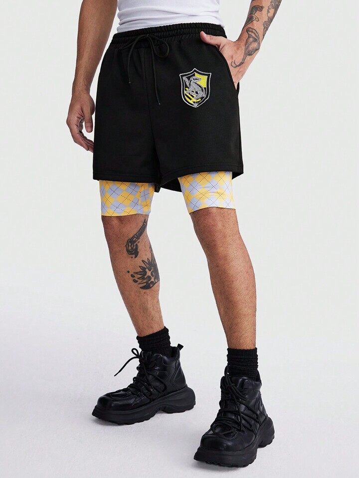 Harry Potter | ROMWE Men's Badge And Argyle Print Drawstring Waist 2 In 1 Shorts, School