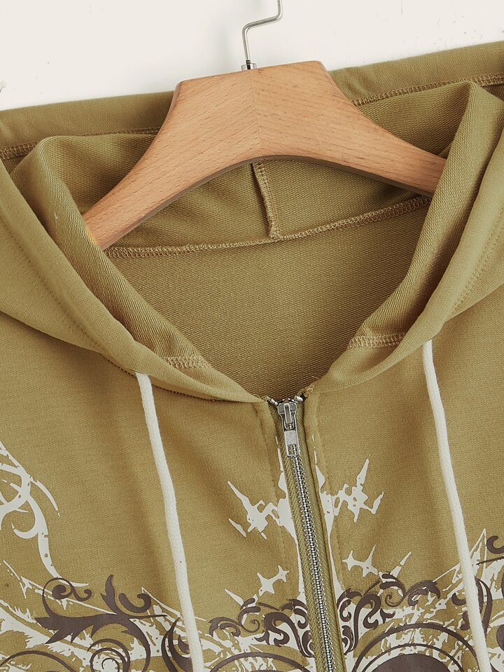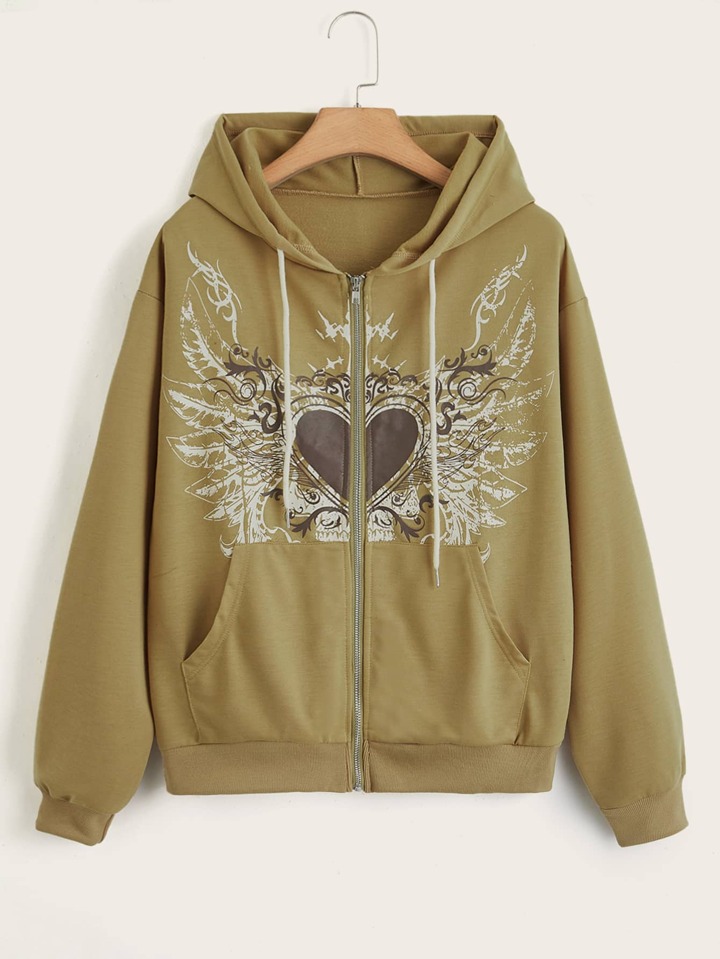 Heart Graphic Zip Up Pocket Drawstring Hoodie