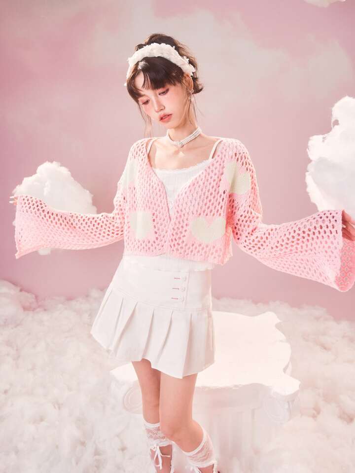 Heart Pattern Drop Shoulder Open Knit Cardigan