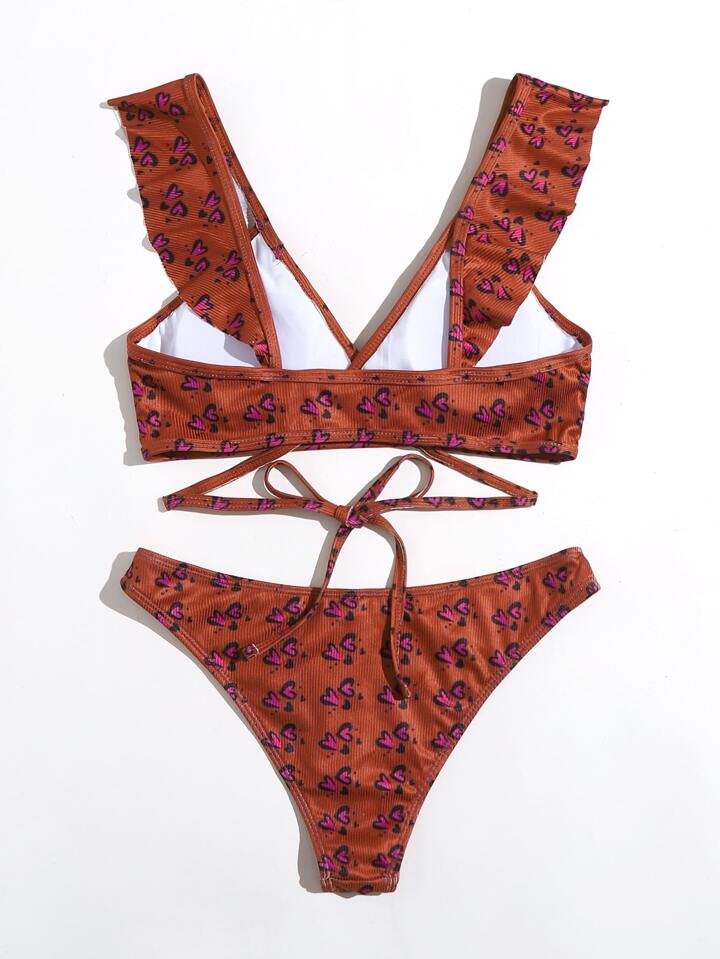 Heart Print Ruffle Wrap Bikini Set, For Summer Beach Vacation