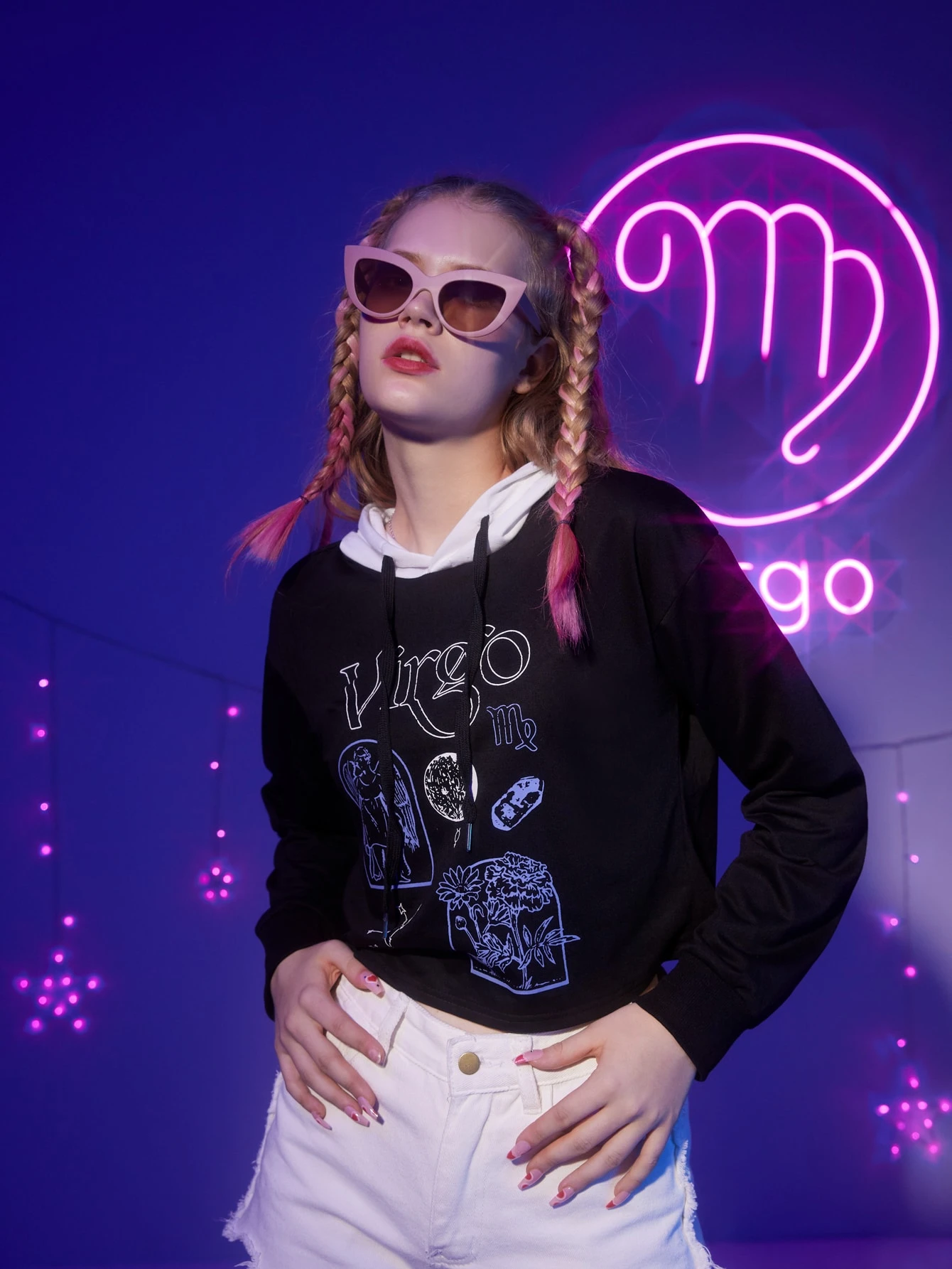 Heyillustration Starsalign Virgo Letter Floral Graphic Colorblock Drawstring Crop Hoodie