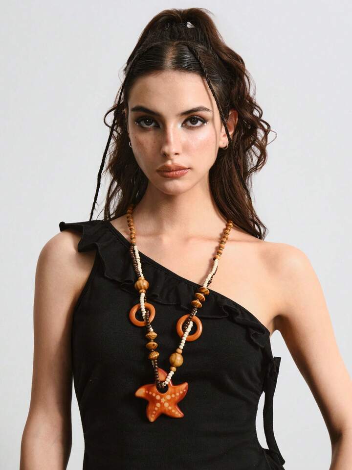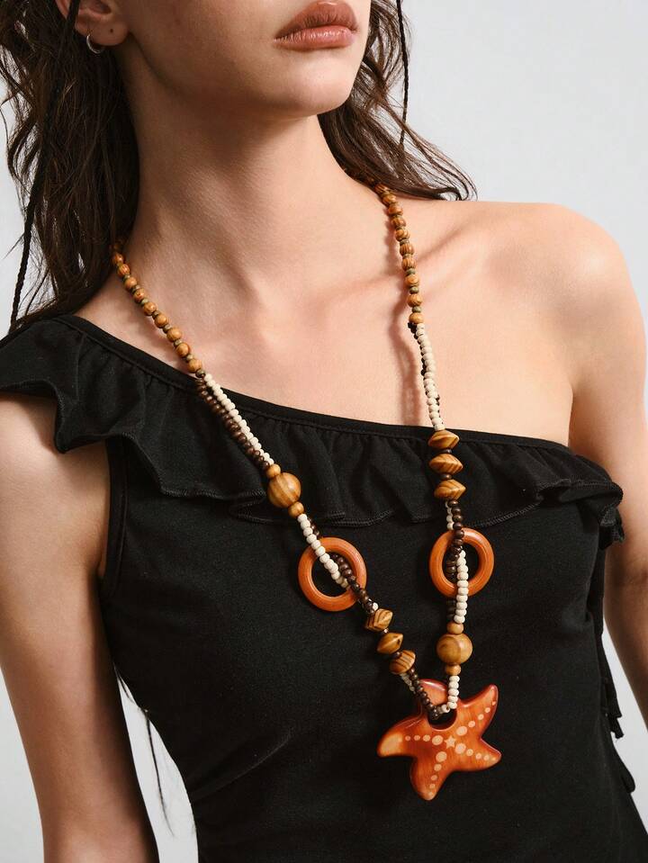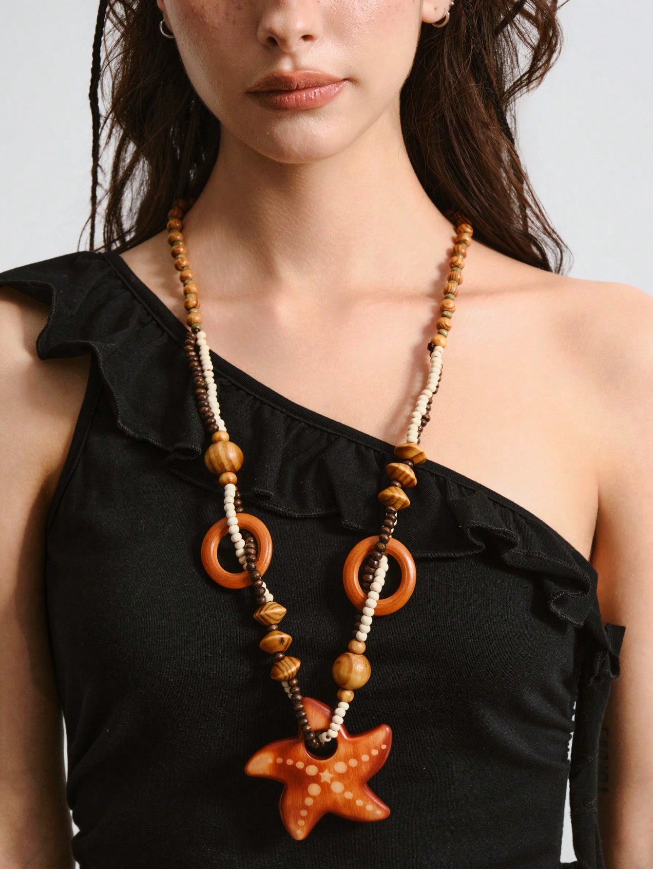 Hippie 1pc Boho-Style Vintage Wooden Starfish Pendant Long Necklace, Fashion Accessories Wholesale For Men And Women