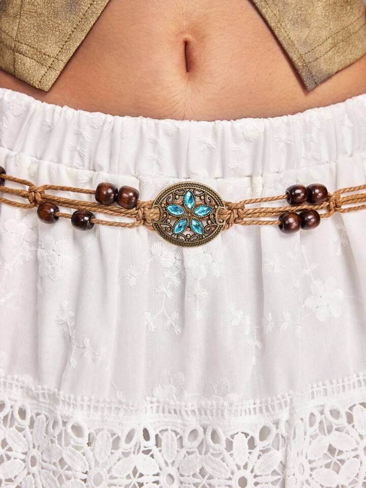 Hippie Bohemian Fashion Versatile Braided Waist Rope Vintage Women's Waist Decoration Waist Belt Beaded Oval Rhinestone Decor Casual Waist Chain