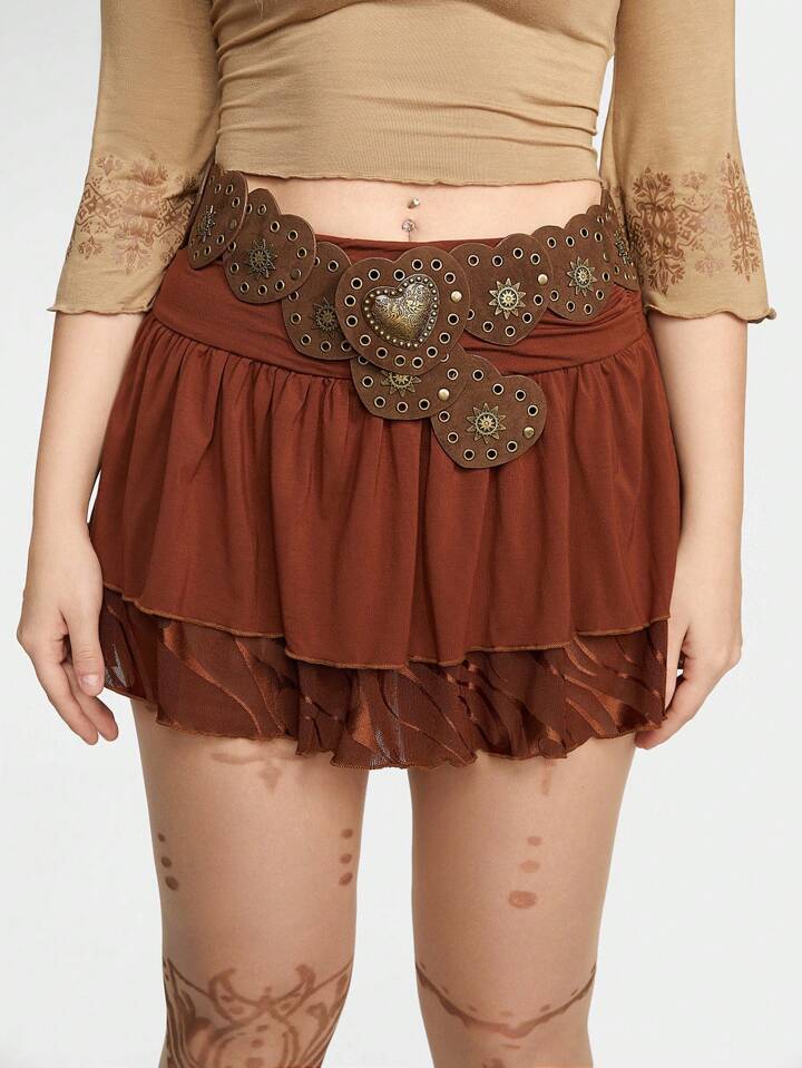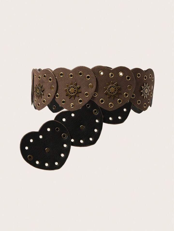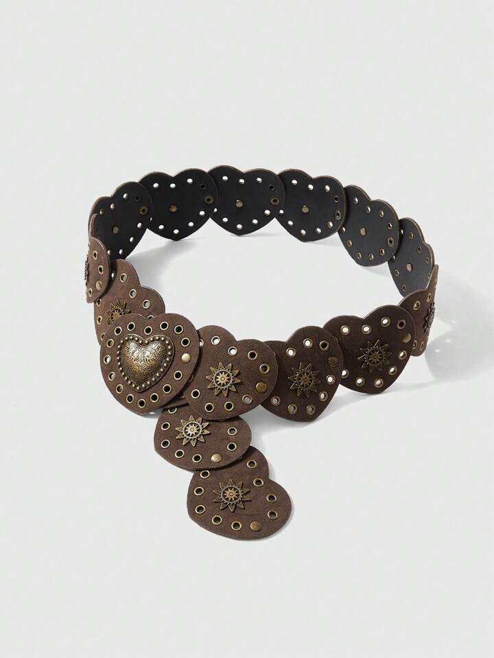 Hippie Bohemian Style Heart Shaped Buckle Studded Wide Pu Western Belt For Women, Vintage Boho