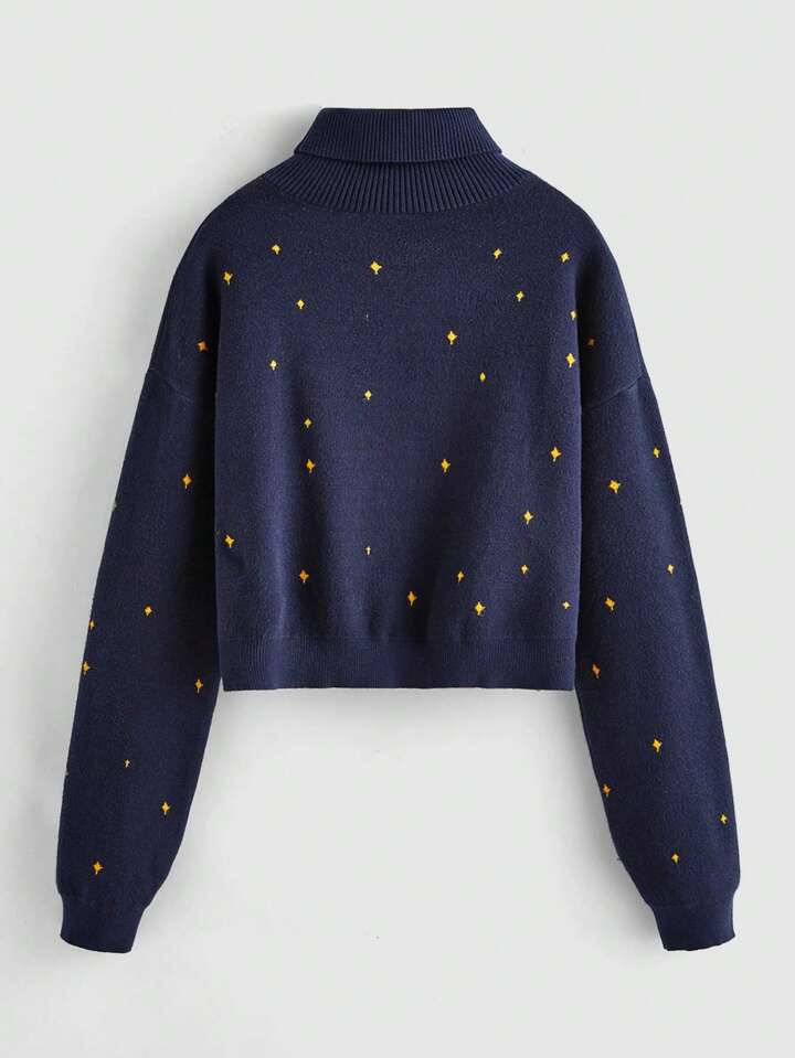 Hippie Cat & Moon Pattern Turtleneck Drop Shoulder Sweater