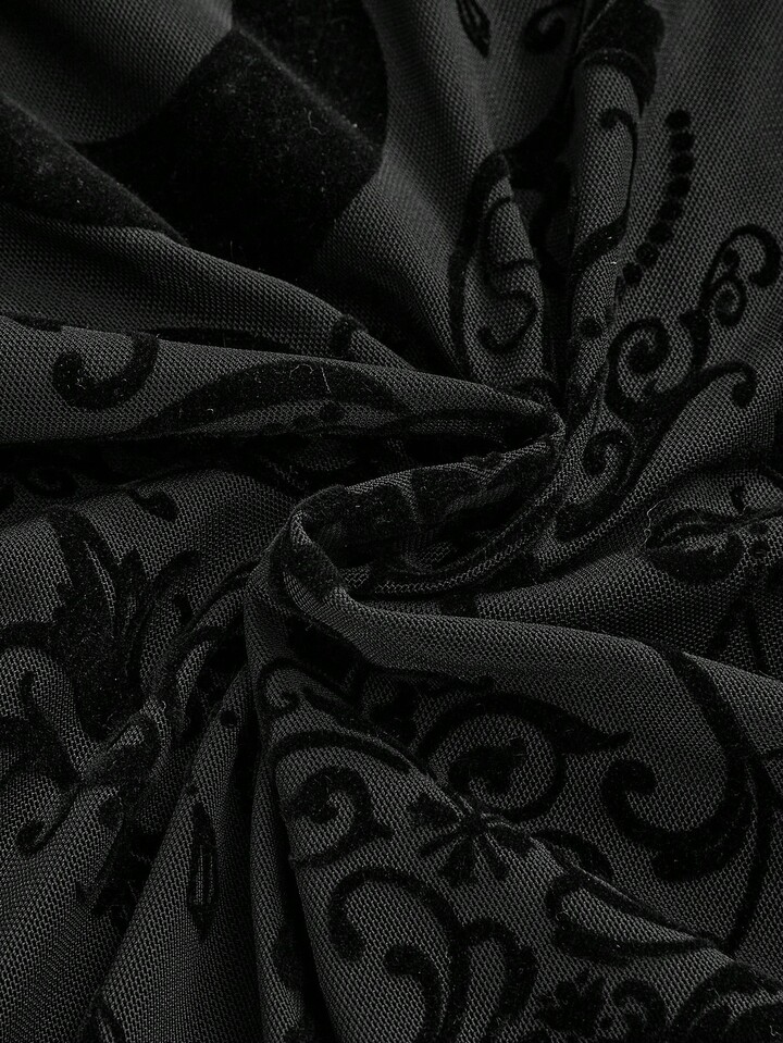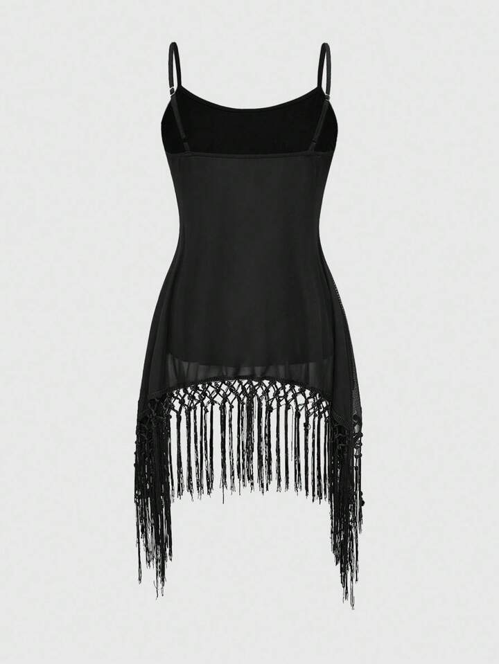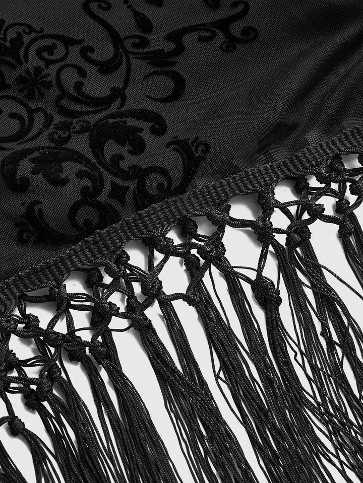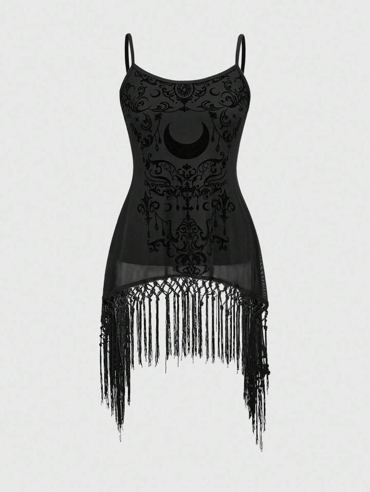 Hippie Flocked Mesh Gothic Dark Ball Sheer Tassel Vacation Dress For Women