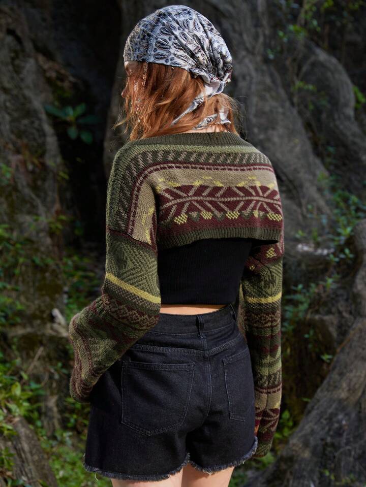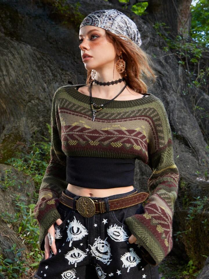 Hippie Geo Pattern Drop Shoulder Crop Sweater