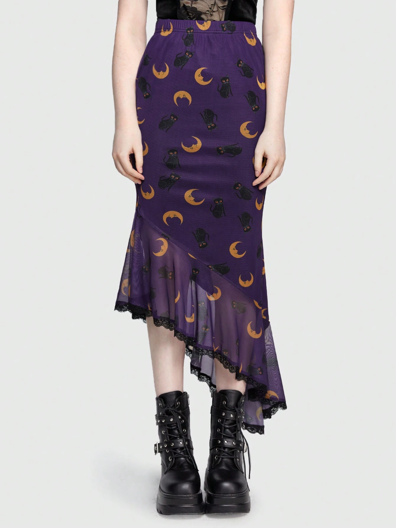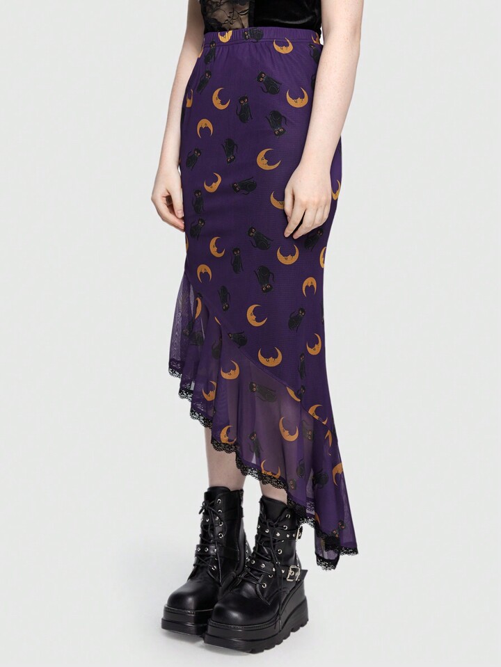Hippie Moon & Cat Print Contrast Mesh Ruffle Hem Skirt