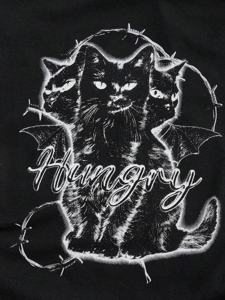 Hippie Plus Size Halloween Cat & Bat Print T-Shirt For Summer