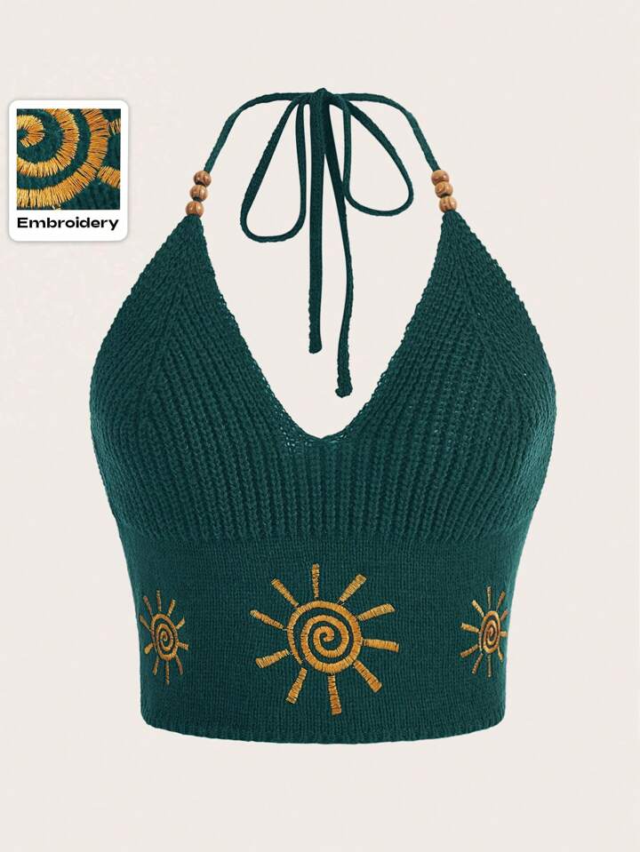 Hippie Plus Size Sun Embroidered Knit Top With Necklace Decoration, Casual Vacation