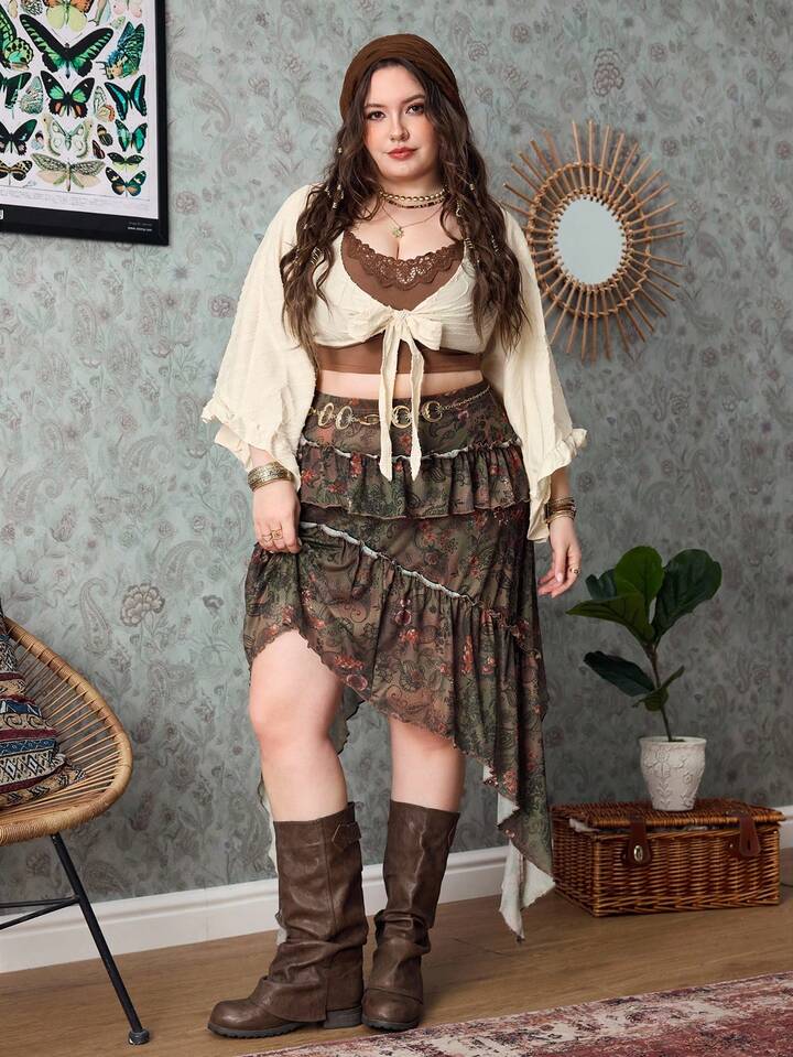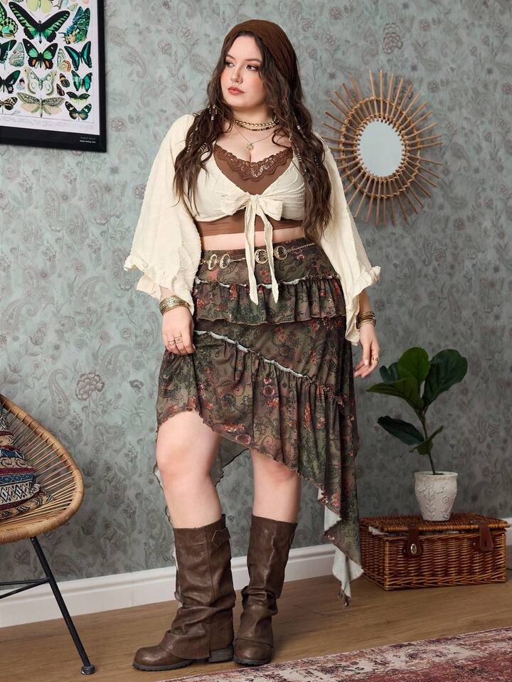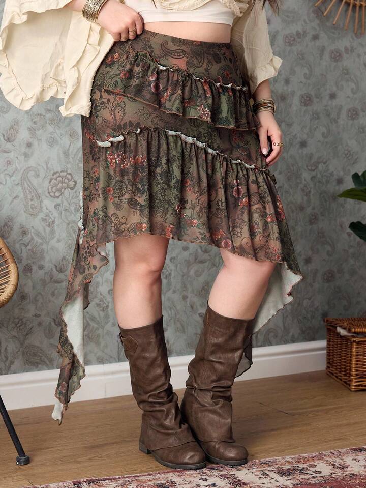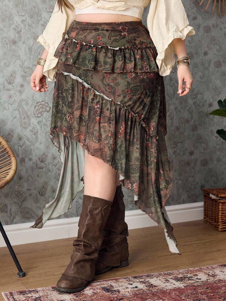 Hippie Plus Size Women Floral Print Elastic Waist Ruffle Hem Asymmetric Hem Skirt