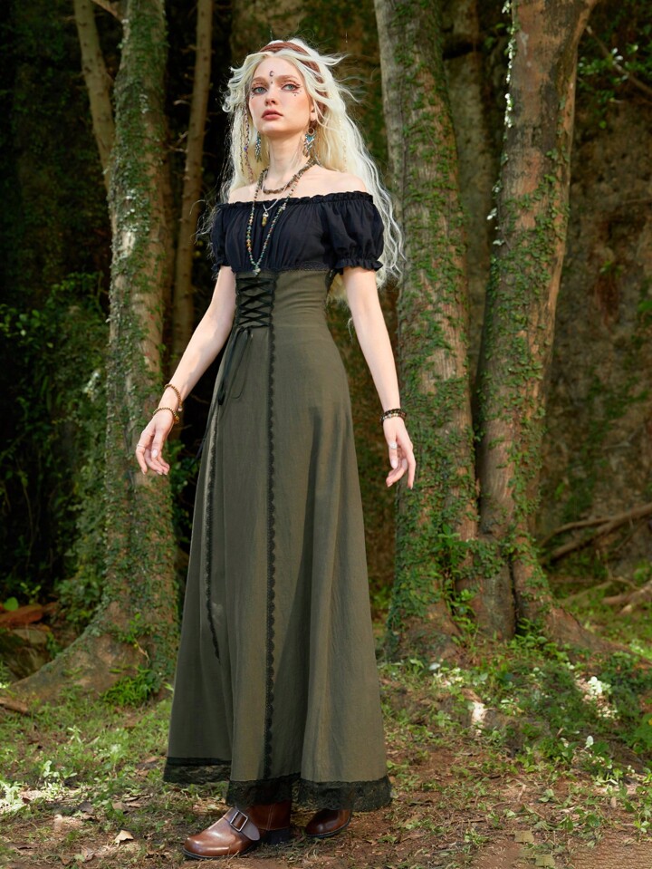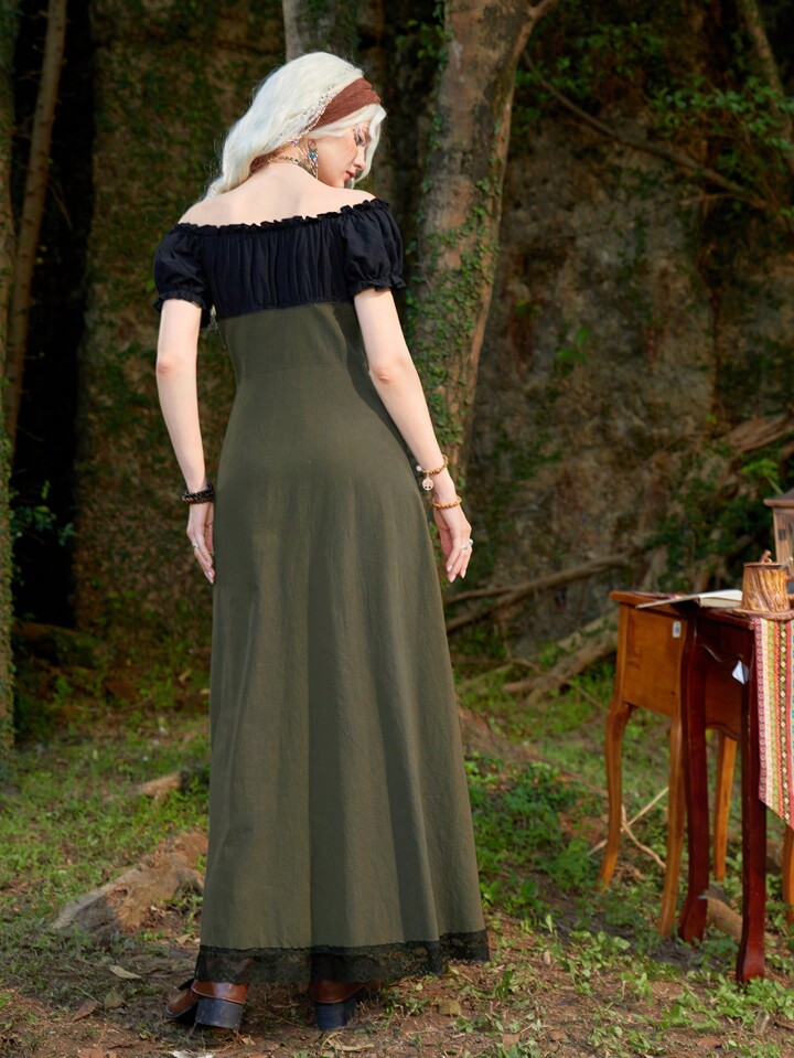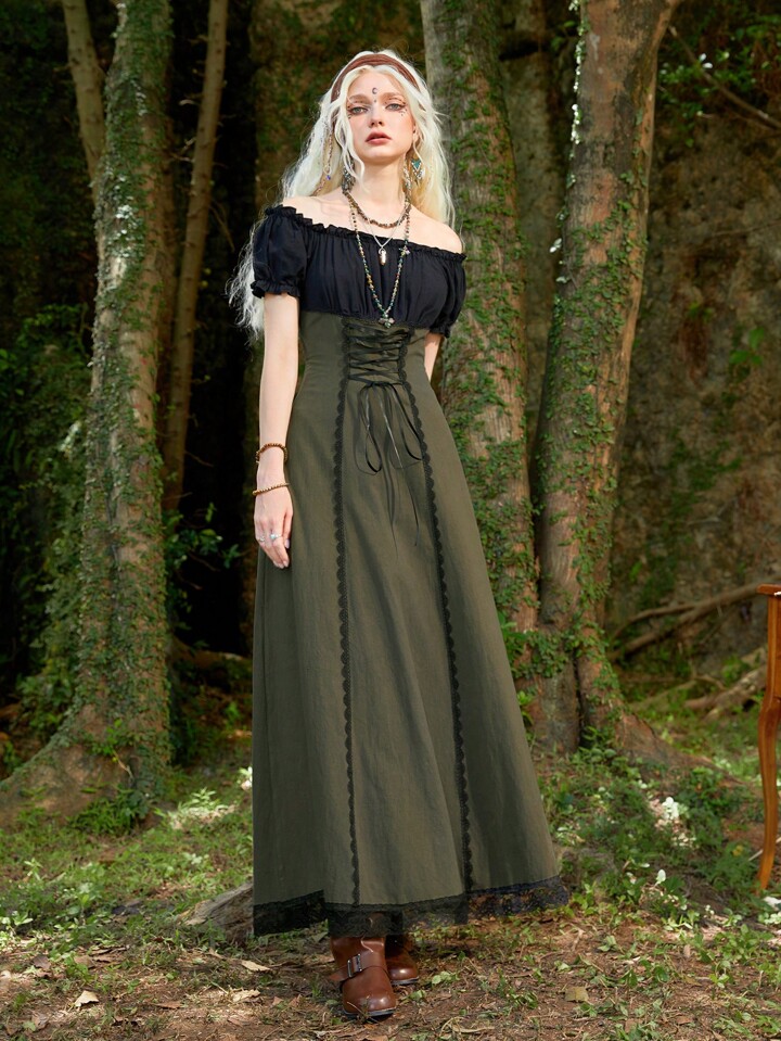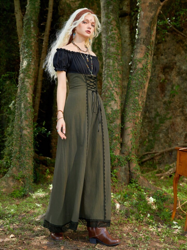 Hippie Renaissance Off Shoulder Lace Up Contrast Lace Dress