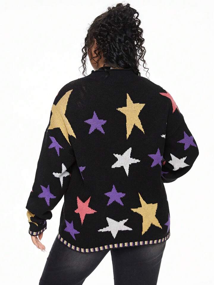Hippie Retro Colorful Star, Moon & Cat Jacquard Pattern Loose Lantern Sleeves Plus Size Turtleneck Sweater