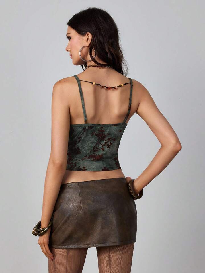 Hippie Style Beaded Fringe Draped Neck Cropped Velvet Floral Tank Top
