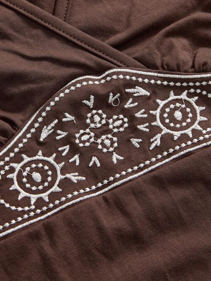 Hippie Summer Beach Vacation Dance Party Music Festival Western Vintage Floral Embroidered Elastic Waist Short Sleeve Brown T-Shirt For Women