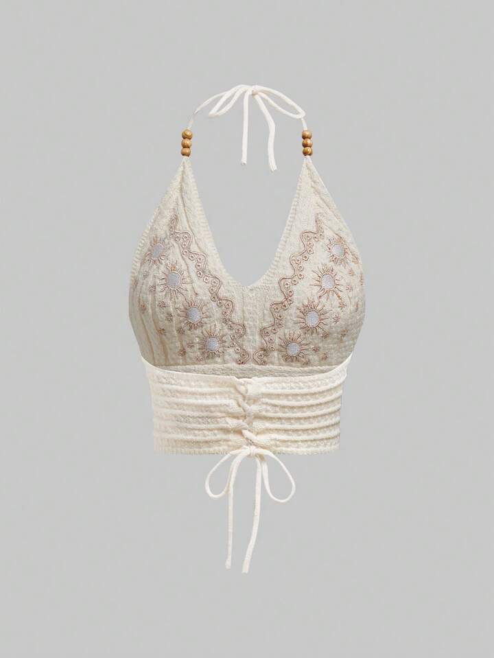 Hippie Summer Embroidered Cross Strap Backless Halter Crochet Knit Top
