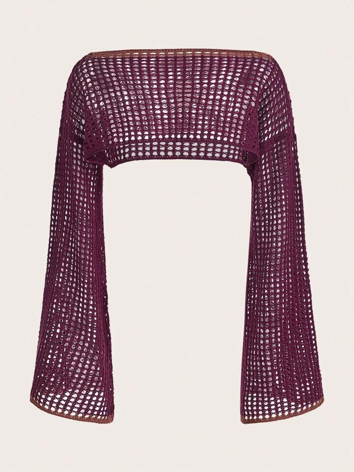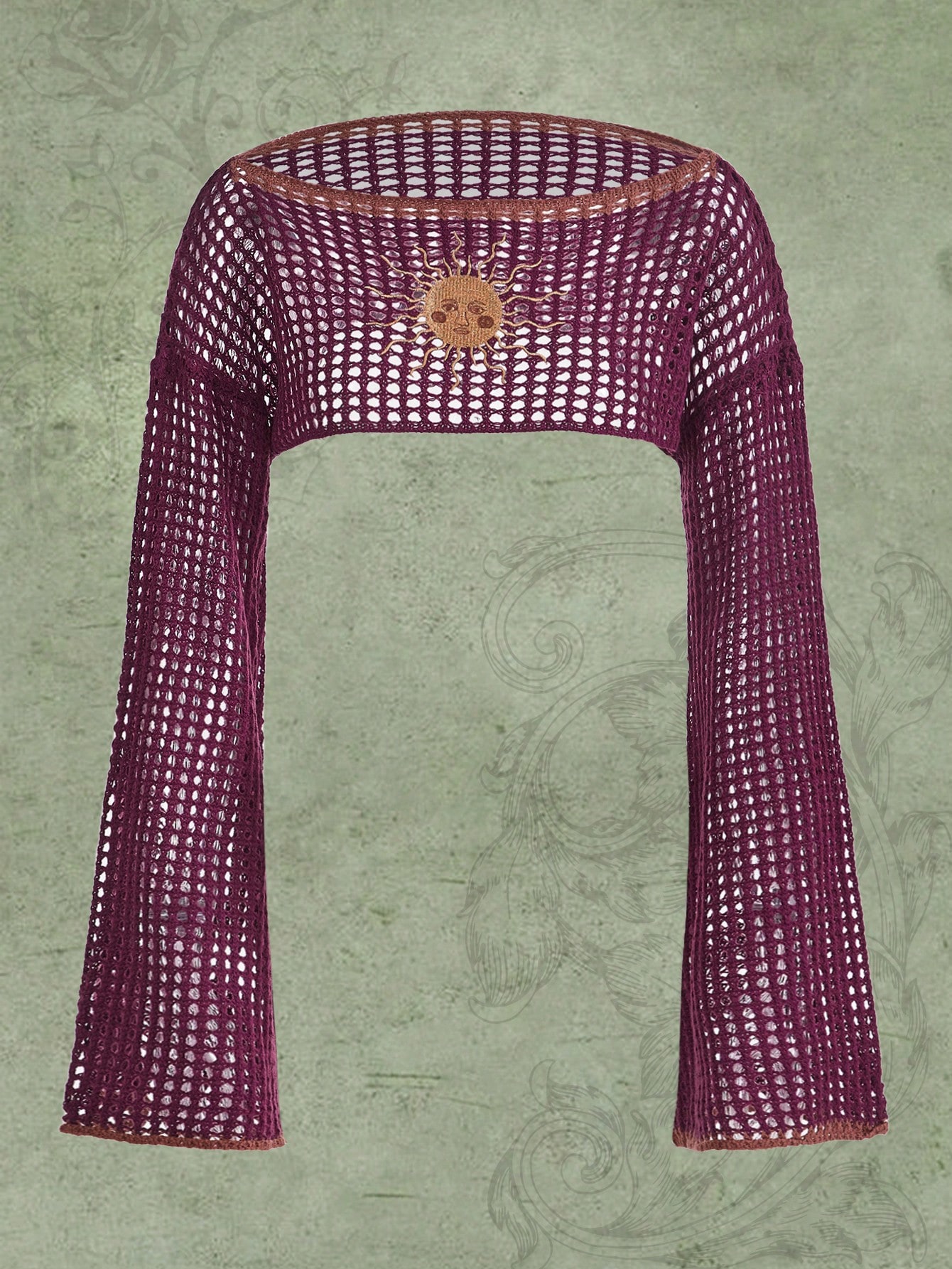 Hippie Sun Embroidery Hollow Out Bell Sleeve Crop Sweater