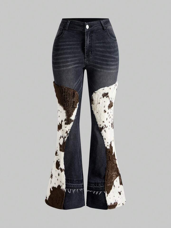 Hippie Women's Y2K Low Waist Cow Print Patchwork Wide-Leg Jeans