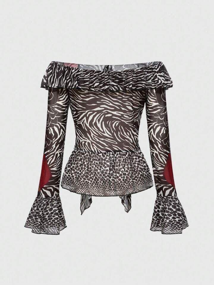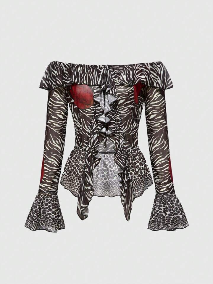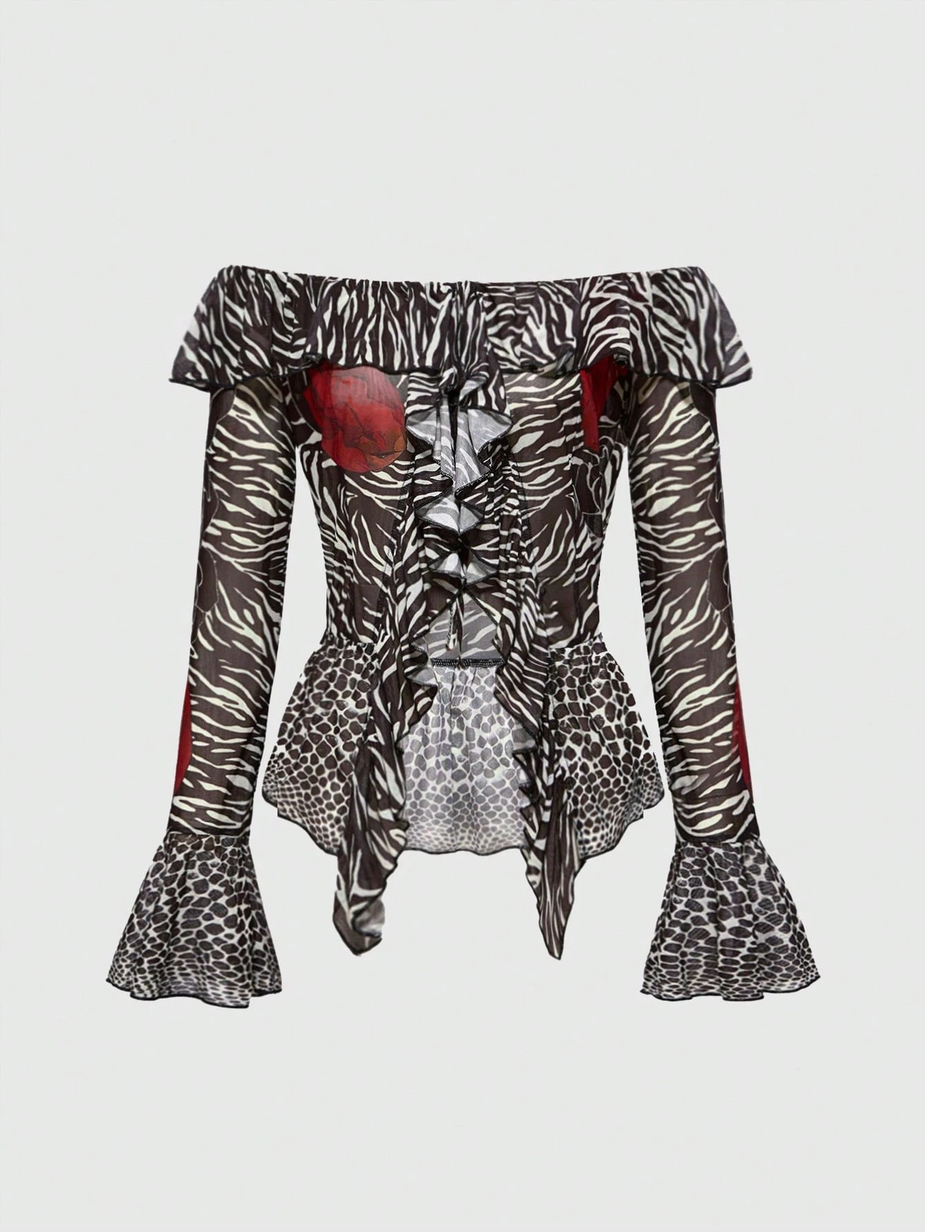 Hippie Y2K Animal Print Off Shoulder Ruffle Hem Wild Beauty Ladies Shirt