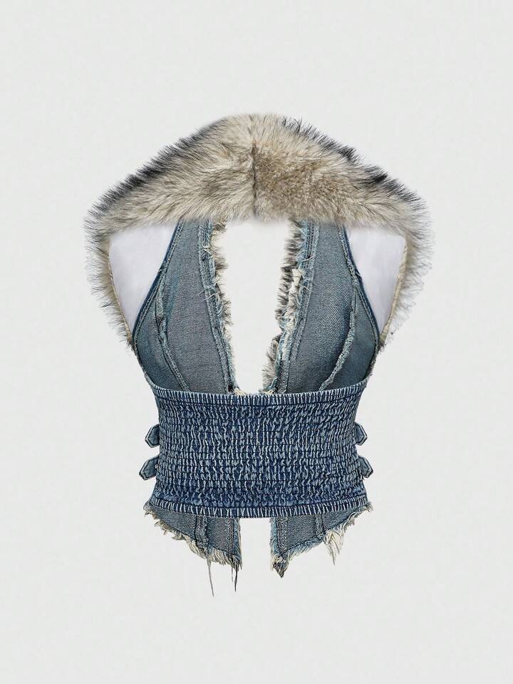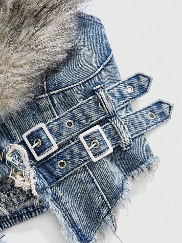Hippie Y2K Removable Faux Fur Collar Denim Jacket For Women
