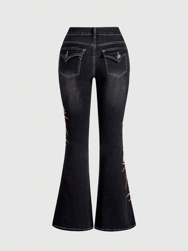 J-FASHION Chinese Style Bamboo Embroidery Women Flared Jeans