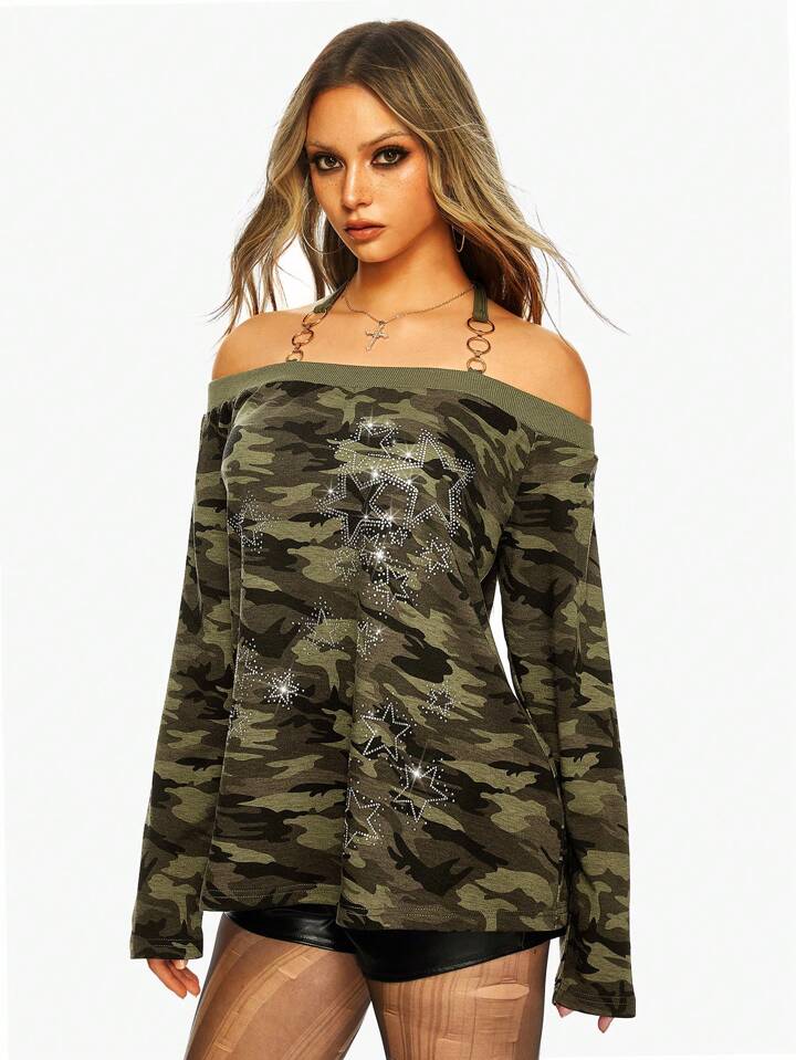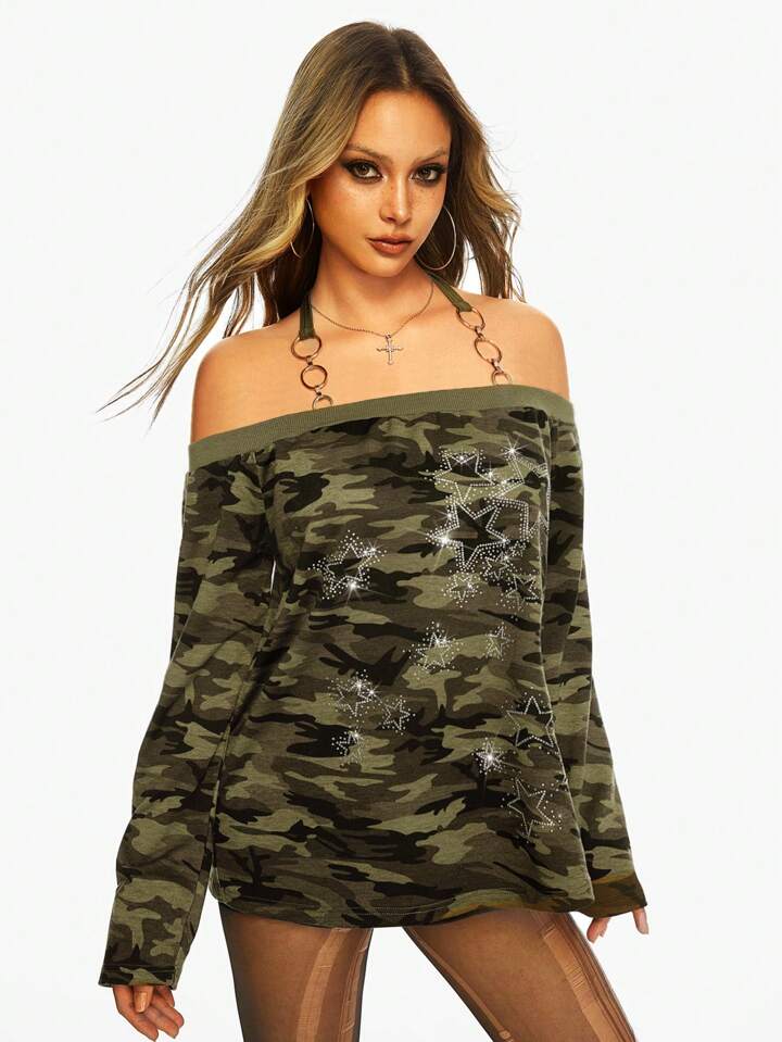 J-Fashion 1pc Women Y2K Harajuku Batwing Loose Off Shoulder Camouflage Pullover Sweatshirt