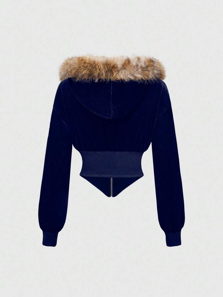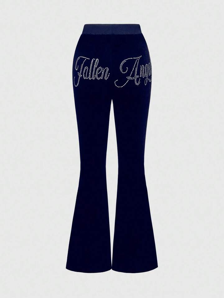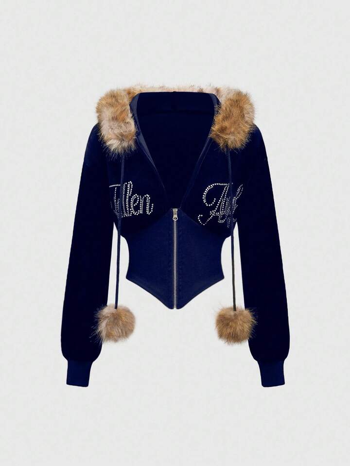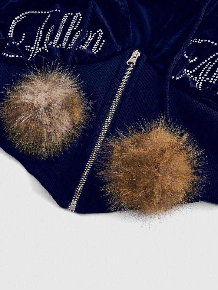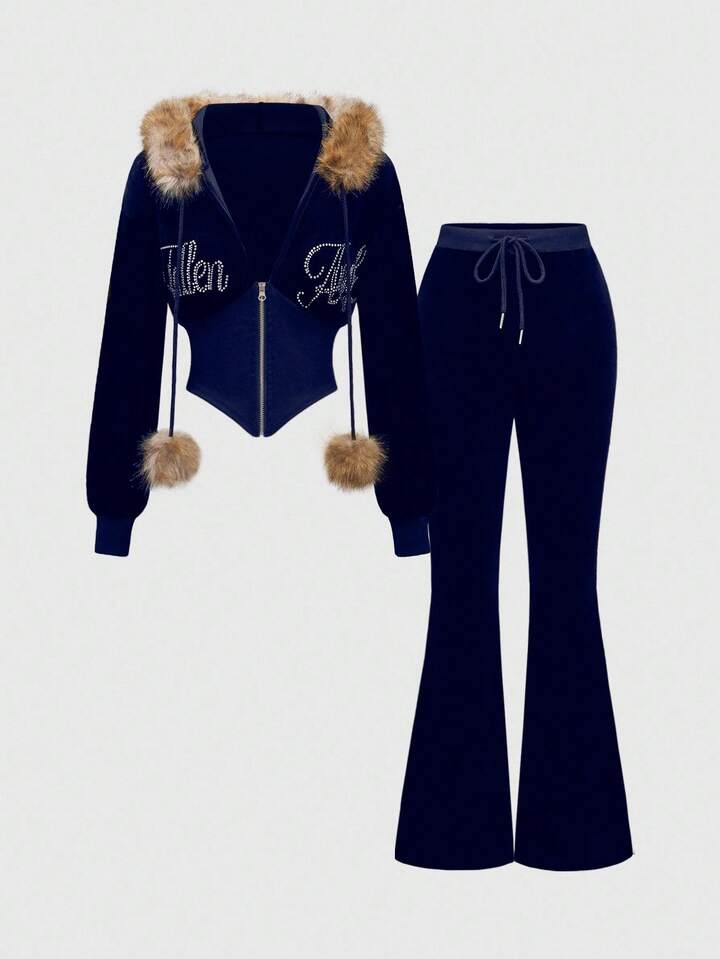 J-Fashion 2pcs Women Y2K Velvet Rhinestone Patchwork Hoodie Top And Pants Set