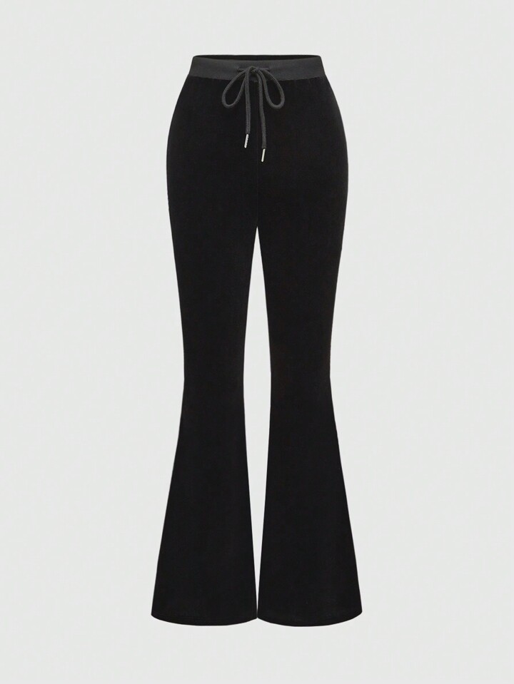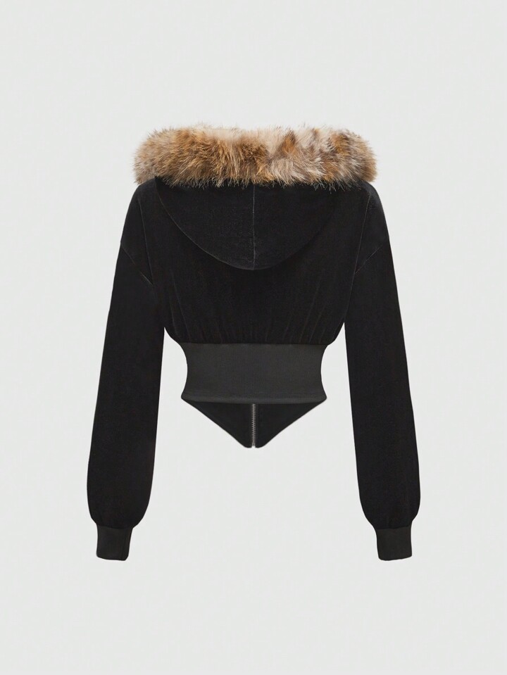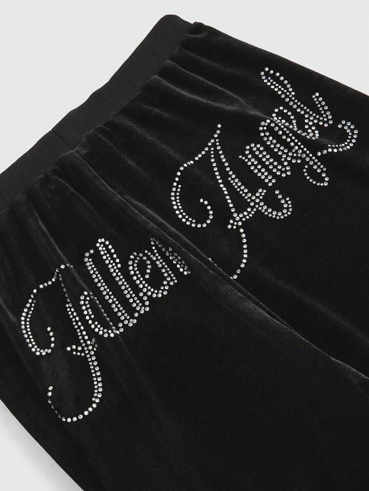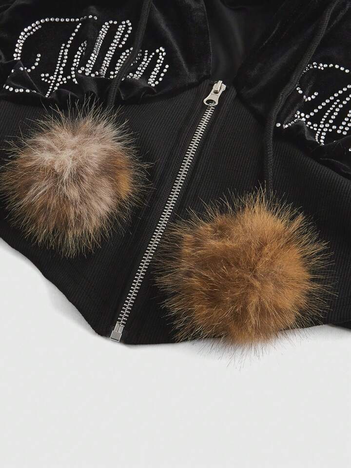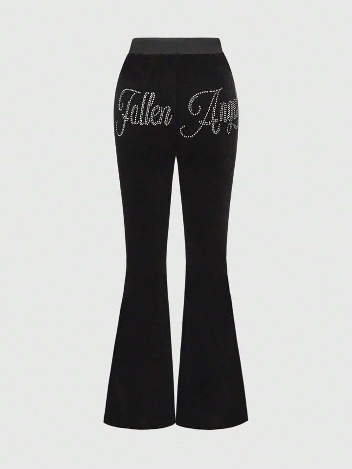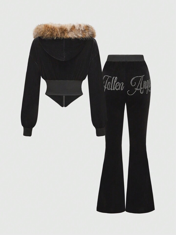 J-Fashion 2pcs Women's Set: Velvet Y2K Rhinestone Patchwork Hooded Coat With Flared Pants