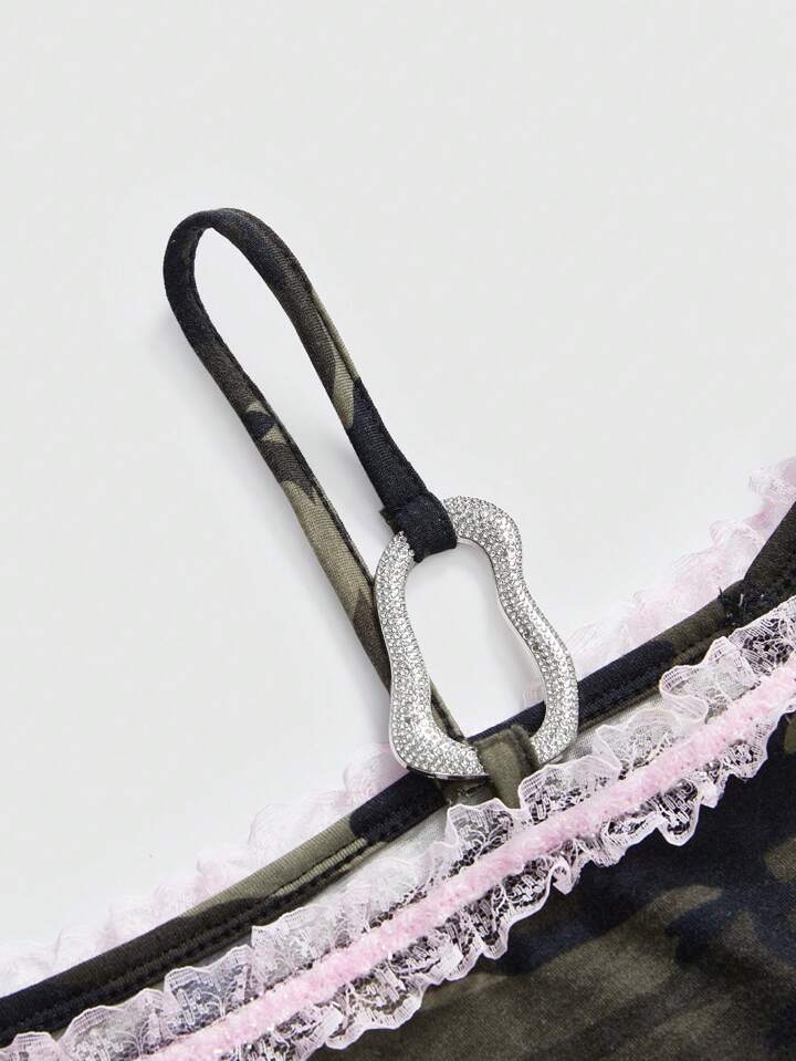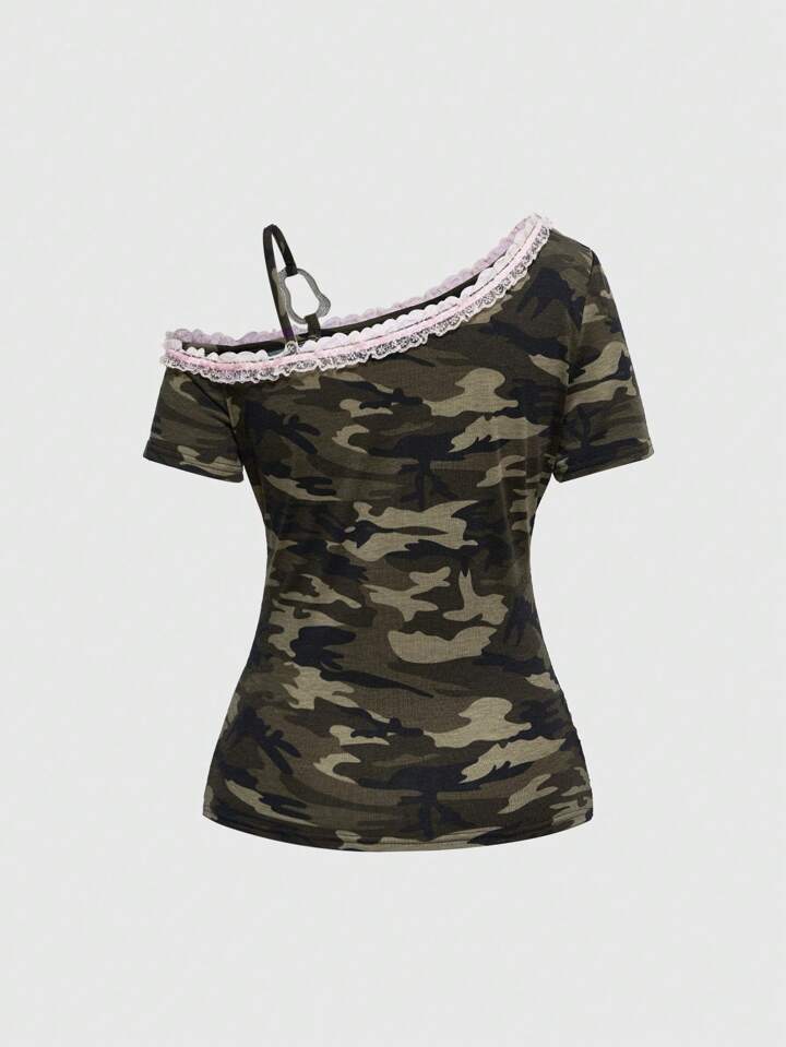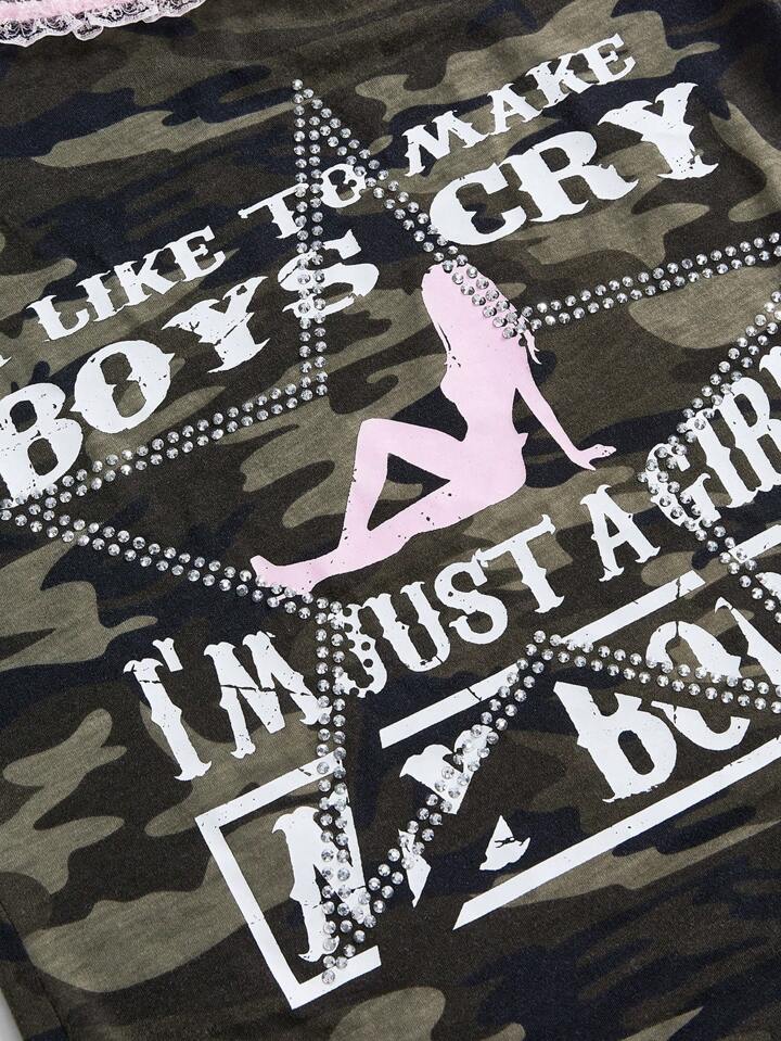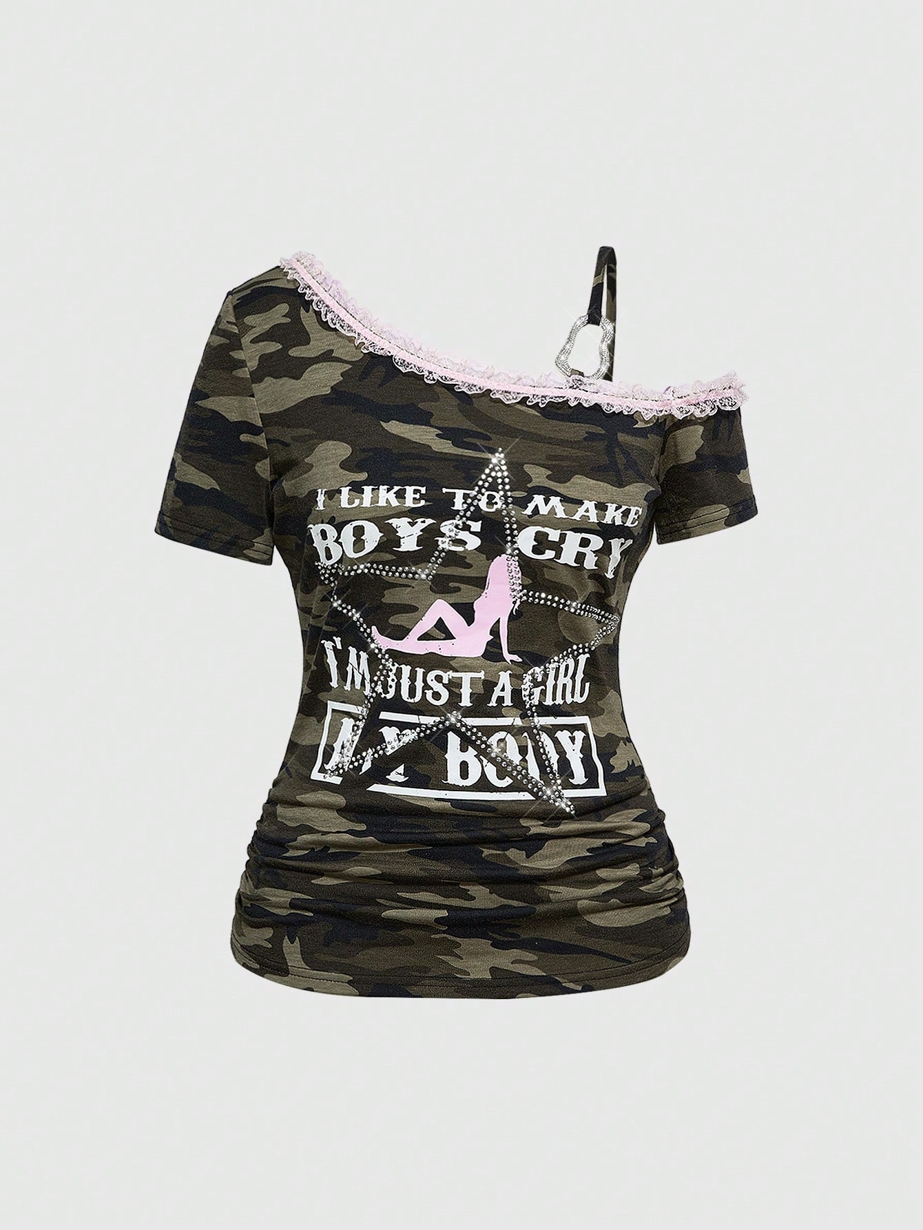 J-Fashion Abby Y2K Chic Girl Figure Printed Rhinestone & Camouflage Oblique Shoulder Sexy T-Shirt
