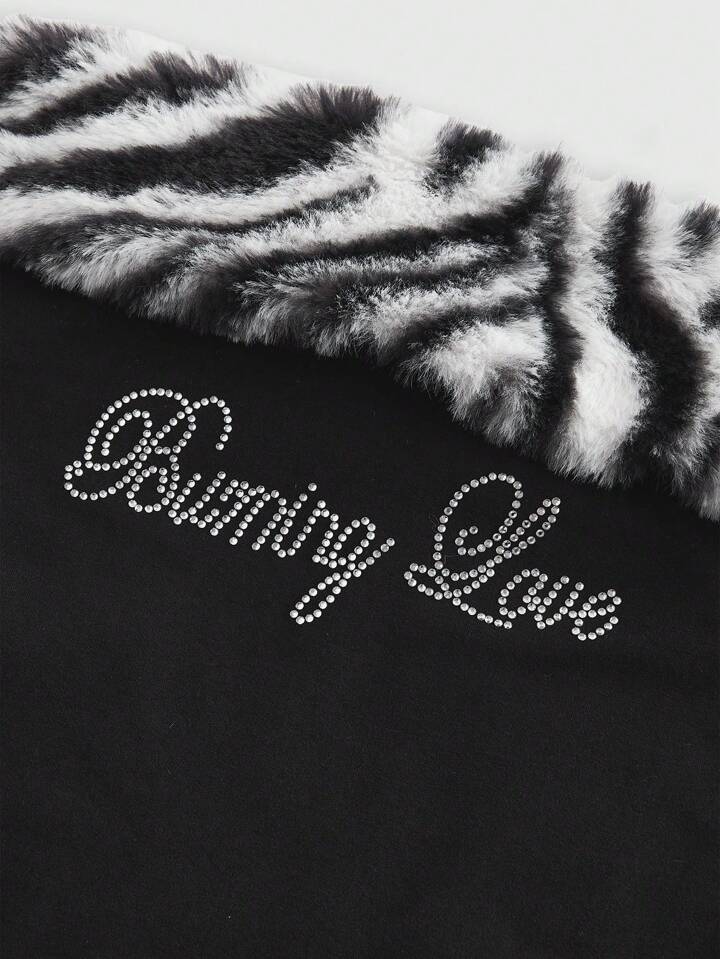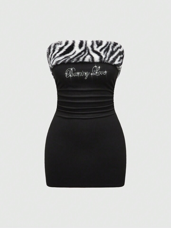 J-Fashion Gyaru Shibuya Subculture Mohair Patchwork Zebra Print Rhinestone Decor Tight Fitted Midi Bodycon Strapless Dress, For Carnival