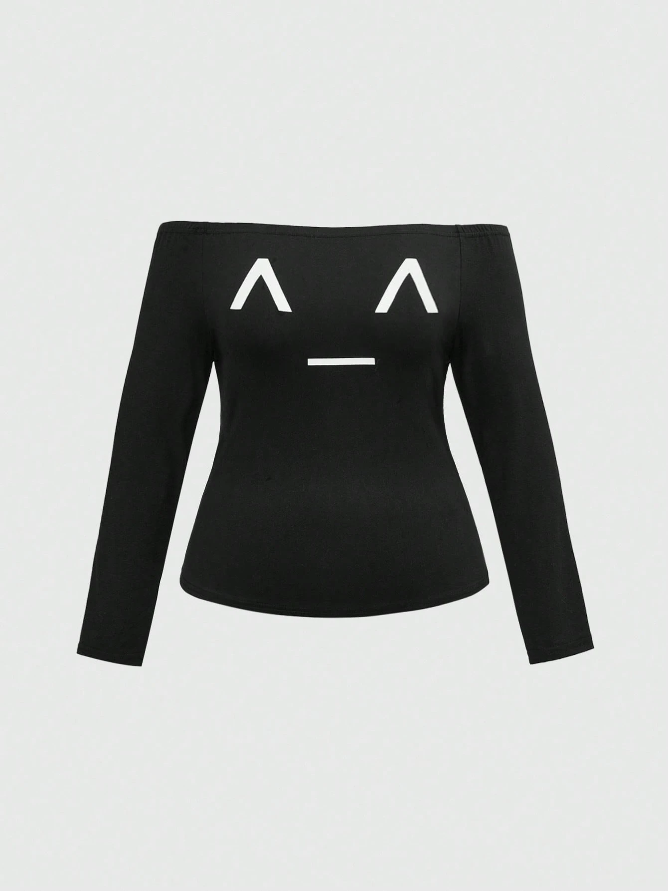 J-Fashion Plus Size Casual Emoticon Print Off Shoulder Fitted Women T-Shirt Top