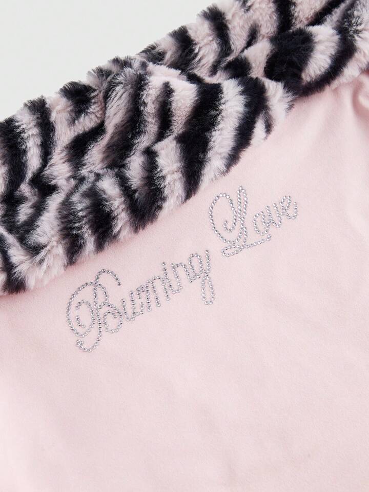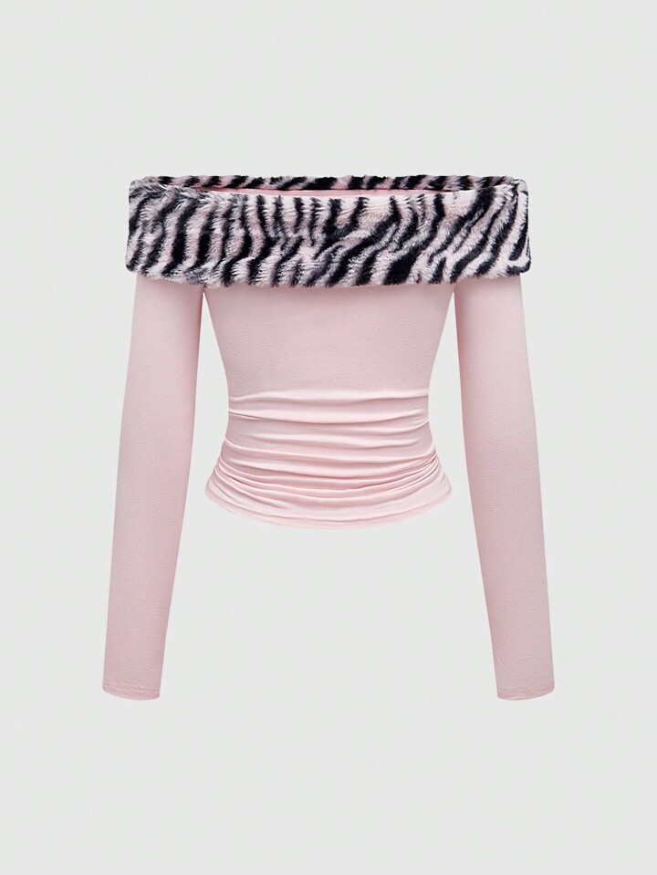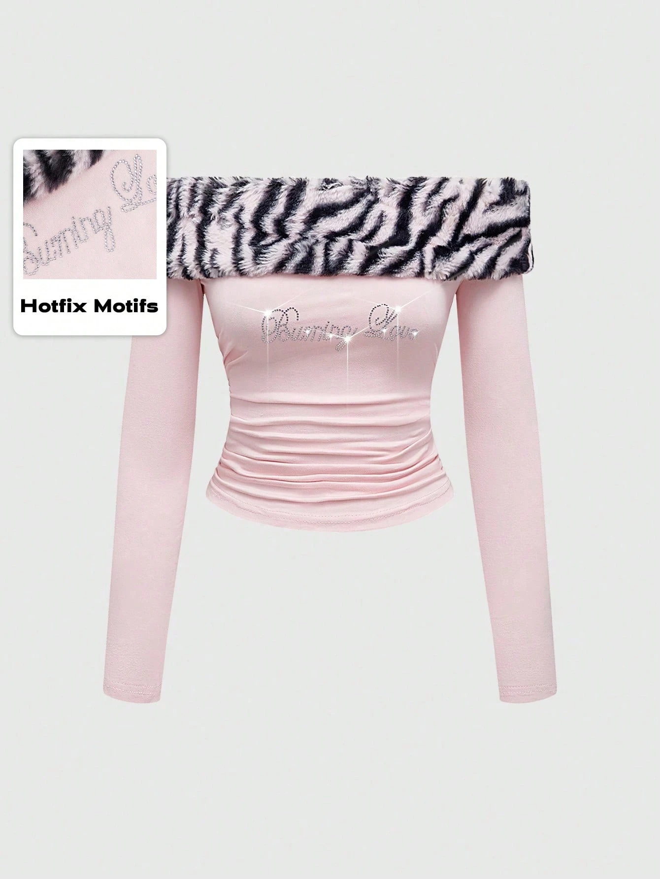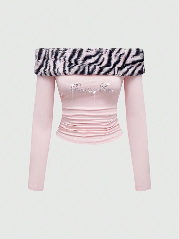 J-Fashion Shibuya Subculture Faux Fur Zebra Print Patchwork Knit Slim Fit Rhinestone Embellished Women Top, Valentine's Day