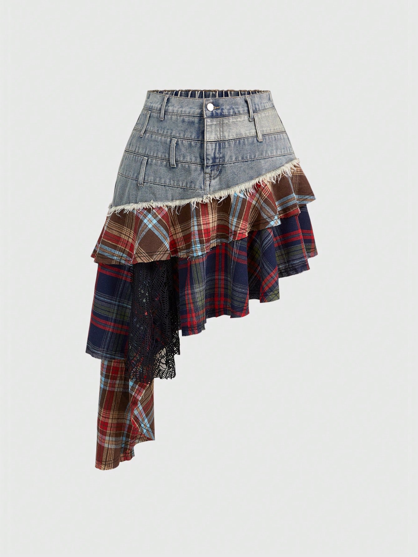 J-Fashion Spring/Summer Plus Size Retro Y2K Plaid Mesh Patchwork Asymmetrical Hem Denim Mini Skirt